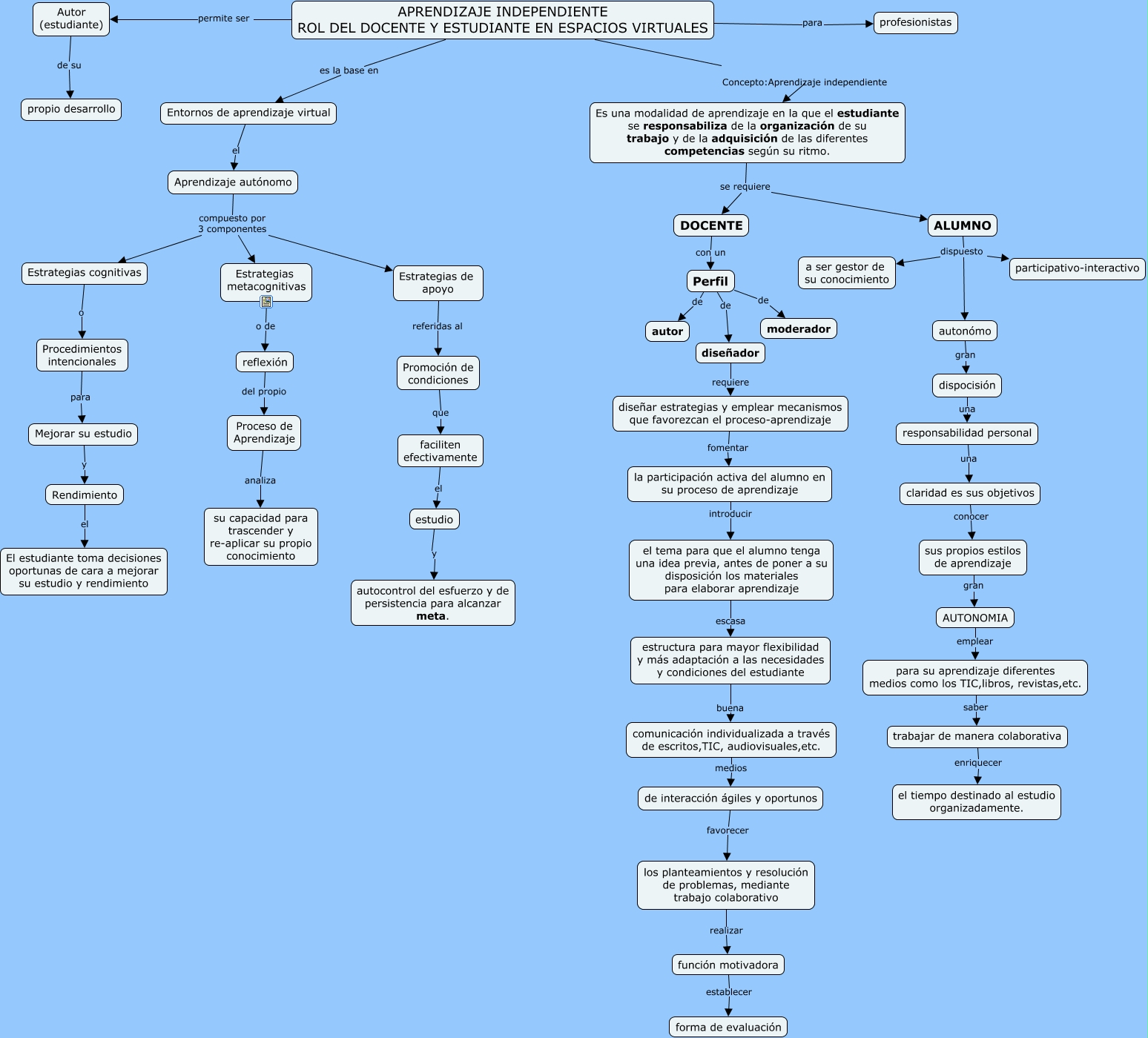 Este Cmap, tiene información relacionada con: APRENDIZAJE INDEPENDIENTE ROL DEL DOCENTE Y ESTUDIANTE EN ESPACIOS VIRTUALES (PROFESIONISTAS), AUTONOMIA emplear para su aprendizaje diferentes medios como los TIC,libros, revistas,etc., ALUMNO dispuesto a ser gestor de su conocimiento, trabajar de manera colaborativa enriquecer el tiempo destinado al estudio organizadamente., Perfil de autor, DOCENTE con un Perfil, claridad es sus objetivos conocer sus propios estilos de aprendizaje, dispocisión una responsabilidad personal, Mejorar su estudio y Rendimiento, autonómo gran dispocisión, Estrategias de apoyo referidas al Promoción de condiciones, responsabilidad personal una claridad es sus objetivos, Estrategias metacognitivas o de reflexión, comunicación individualizada a través de escritos,TIC, audiovisuales,etc. medios de interacción ágiles y oportunos, ALUMNO dispuesto autonómo, ALUMNO dispuesto participativo-interactivo, APRENDIZAJE INDEPENDIENTE ROL DEL DOCENTE Y ESTUDIANTE EN ESPACIOS VIRTUALES para profesionistas, para su aprendizaje diferentes medios como los TIC,libros, revistas,etc. saber trabajar de manera colaborativa, función motivadora establecer forma de evaluación, Es una modalidad de aprendizaje en la que el estudiante se responsabiliza de la organización de su trabajo y de la adquisición de las diferentes competencias según su ritmo. se requiere ALUMNO, Aprendizaje autónomo compuesto por 3 componentes Estrategias cognitivas