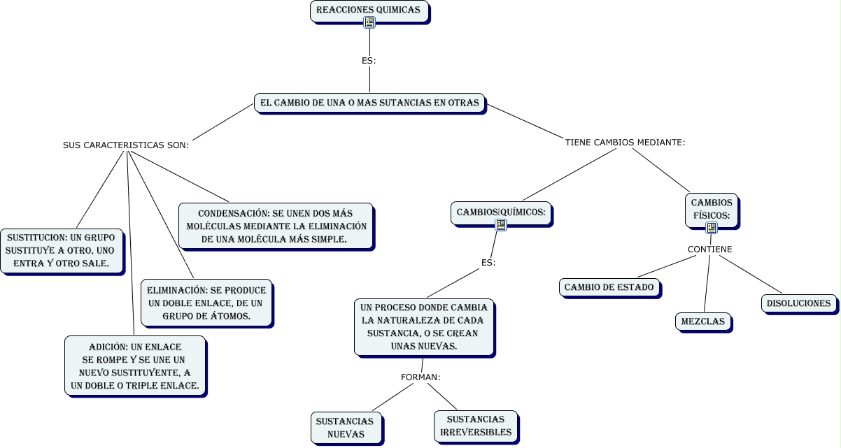 Este Cmap, tiene información relacionada con: MAPA CONCEPTUAL, UN PROCESO DONDE CAMBIA LA NATURALEZA DE CADA SUSTANCIA, O SE CREAN UNAS NUEVAS. FORMAN: SUSTANCIAS IRREVERSIBLES, el cambio de una o mas sutancias en otras TIENE CAMBIOS MEDIANTE: CAMBIOS FÍSICOS:, eLIMINACIÓN: SE PRODUCE UN DOBLE ENLACE, DE UN GRUPO DE ÁTOMOS. SUS CARACTERISTICAS SON: ADICIÓN: UN ENLACE SE ROMPE Y SE UNE UN NUEVO SUSTITUYENTE, A UN DOBLE O TRIPLE ENLACE., CAMBIOS FÍSICOS: CONTIENE MEZCLAS, CAMBIOS FÍSICOS: CONTIENE cAMBIO DE ESTADO, CAMBIOS qUÍMICOS: ES: UN PROCESO DONDE CAMBIA LA NATURALEZA DE CADA SUSTANCIA, O SE CREAN UNAS NUEVAS., SUSTITUCION: UN GRUPO SUSTITUYE A OTRO, UNO ENTRA Y OTRO SALE. SUS CARACTERISTICAS SON: CONDENSACIÓN: SE UNEN DOS MÁS MOLÉCULAS MEDIANTE LA ELIMINACIÓN DE UNA MOLÉCULA MÁS SIMPLE., SUSTITUCION: UN GRUPO SUSTITUYE A OTRO, UNO ENTRA Y OTRO SALE. SUS CARACTERISTICAS SON: el cambio de una o mas sutancias en otras, CAMBIOS FÍSICOS: CONTIENE DISOLUCIONES, REACCIONES QUIMICAS ES: el cambio de una o mas sutancias en otras, el cambio de una o mas sutancias en otras TIENE CAMBIOS MEDIANTE: CAMBIOS qUÍMICOS:, eLIMINACIÓN: SE PRODUCE UN DOBLE ENLACE, DE UN GRUPO DE ÁTOMOS. SUS CARACTERISTICAS SON: CONDENSACIÓN: SE UNEN DOS MÁS MOLÉCULAS MEDIANTE LA ELIMINACIÓN DE UNA MOLÉCULA MÁS SIMPLE., UN PROCESO DONDE CAMBIA LA NATURALEZA DE CADA SUSTANCIA, O SE CREAN UNAS NUEVAS. FORMAN: SUSTANCIAS NUEVAS, eLIMINACIÓN: SE PRODUCE UN DOBLE ENLACE, DE UN GRUPO DE ÁTOMOS. SUS CARACTERISTICAS SON: el cambio de una o mas sutancias en otras, SUSTITUCION: UN GRUPO SUSTITUYE A OTRO, UNO ENTRA Y OTRO SALE. SUS CARACTERISTICAS SON: ADICIÓN: UN ENLACE SE ROMPE Y SE UNE UN NUEVO SUSTITUYENTE, A UN DOBLE O TRIPLE ENLACE.