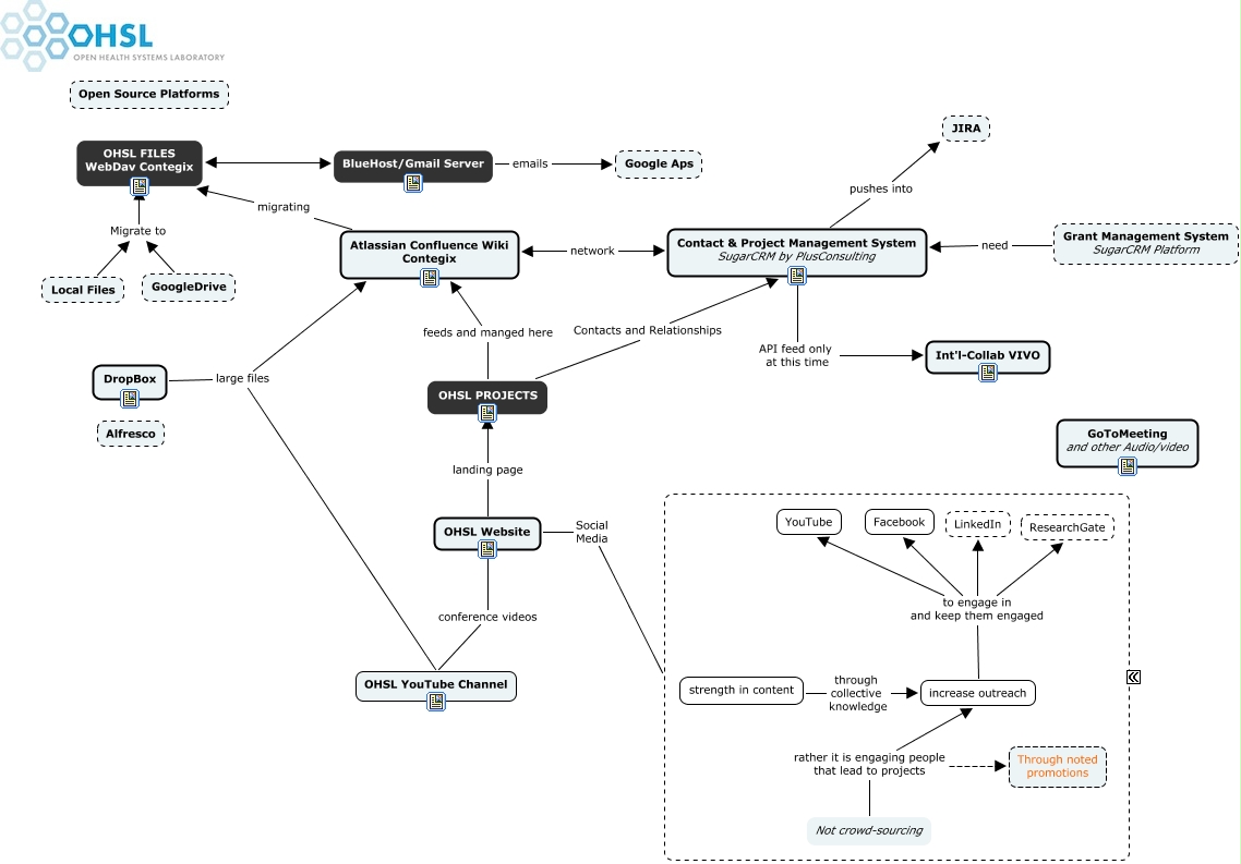 This Concept Map, created with IHMC CmapTools, has information related to: Copy of OHSLCollabComm09Jan13_AppFusions, Contact & Project Management System SugarCRM by PlusConsulting pushes into JIRA, Atlassian Confluence Wiki Contegix migrating OHSL FILES WebDav Contegix, increase outreach to engage in and keep them engaged ResearchGate, OHSL Website landing page OHSL PROJECTS, Local Files Migrate to OHSL FILES WebDav Contegix, OHSL Website Social Media Social Media Platforms, strength in content through collective knowledge increase outreach, OHSL Website conference videos OHSL YouTube Channel, DropBox large files Atlassian Confluence Wiki Contegix, increase outreach to engage in and keep them engaged LinkedIn, BlueHost/Gmail Server emails Google Aps, OHSL FILES WebDav Contegix BlueHost/Gmail Server, Contact & Project Management System SugarCRM by PlusConsulting API feed only at this time Int'l-Collab VIVO, OHSL PROJECTS Contacts and Relationships Contact & Project Management System SugarCRM by PlusConsulting, increase outreach to engage in and keep them engaged Facebook, Not crowd-sourcing rather it is engaging people that lead to projects increase outreach, GoogleDrive Migrate to OHSL FILES WebDav Contegix, DropBox large files OHSL YouTube Channel, OHSL PROJECTS feeds and manged here Atlassian Confluence Wiki Contegix, Grant Management System SugarCRM Platform need Contact & Project Management System SugarCRM by PlusConsulting