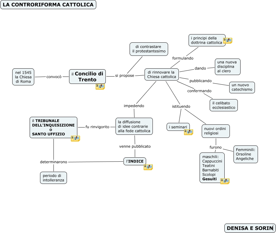 This Concept Map, created with IHMC CmapTools, has information related to: 4) La Controriforma cattolica (AA), nel 1545 la Chiesa di Roma convocò il Concilio di Trento, il Concilio di Trento si propose di contrastare il protestantesimo, la diffusione di idee contrarie alla fede cattolica fu rinvigorito il TRIBUNALE DELL'INQUISIZIONE O SANTO UFFIZIO, di rinnovare la Chiesa cattolica confermando il celibato ecclesiastico, il TRIBUNALE DELL'INQUISIZIONE O SANTO UFFIZIO determinarono l'INDICE, nuovi ordini religiosi furono maschili: Cappuccini Teatini Barnabiti Scolopi Gesuiti, di rinnovare la Chiesa cattolica istituendo nuovi ordini religiosi, di rinnovare la Chiesa cattolica istituendo i seminari, di rinnovare la Chiesa cattolica dando una nuova disciplina al clero, di rinnovare la Chiesa cattolica impedendo la diffusione di idee contrarie alla fede cattolica, il TRIBUNALE DELL'INQUISIZIONE O SANTO UFFIZIO determinarono periodo di intolleranza, il Concilio di Trento si propose di rinnovare la Chiesa cattolica, di rinnovare la Chiesa cattolica formulando i principi della dottrina cattolica, la diffusione di idee contrarie alla fede cattolica venne pubblicato l'INDICE, di rinnovare la Chiesa cattolica pubblicando un nuovo catechismo, nuovi ordini religiosi furono Femminili: Orsoline Angeliche