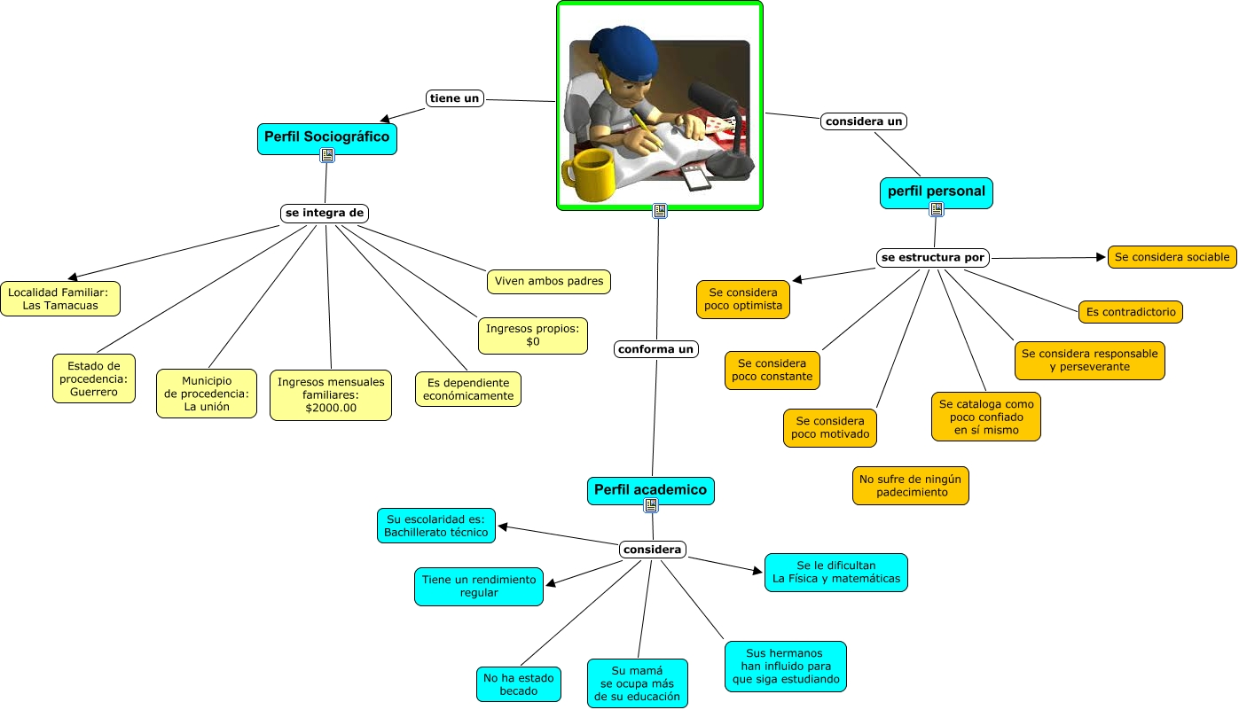 Este Cmap, tiene información relacionada con: MAPA MENTAL ESTUDIANTE A (2), Perfil academico considera Se le dificultan La Física y matemáticas, Perfil academico considera Su mamá se ocupa más de su educación, Perfil Sociográfico se integra de Ingresos mensuales familiares: $2000.00, perfil personal se estructura por Se considera poco constante, Perfil Sociográfico se integra de Ingresos propios: $0, perfil personal se estructura por Se considera responsable y perseverante, conforma un Perfil academico, perfil personal se estructura por Se considera sociable, perfil personal se estructura por Es contradictorio, Perfil Sociográfico se integra de Es dependiente económicamente, Perfil Sociográfico se integra de Municipio de procedencia: La unión, Perfil academico considera Su escolaridad es: Bachillerato técnico, perfil personal se estructura por Se cataloga como poco confiado en sí mismo, perfil personal se estructura por Se considera poco optimista, Perfil Sociográfico se integra de Viven ambos padres, Perfil academico considera No ha estado becado, Perfil academico considera Sus hermanos han influido para que siga estudiando, Perfil academico considera Tiene un rendimiento regular, perfil personal se estructura por Se considera poco motivado, Perfil Sociográfico se integra de Estado de procedencia: Guerrero