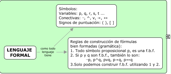 Este Cmap, tiene información relacionada con: FyC_3_Lenguaje_formal, LENGUAJE FORMAL como todo lenguaje tiene Símbolos: Variables: p, q, r, s, t ... Conectivas: ¬, ^, v, →, ↔ Signos de puntuación: ( ), [ ], LENGUAJE FORMAL como todo lenguaje tiene Reglas de construcción de fórmulas bien formadas (gramática): 1. Todo símbolo proposicional p, es una f.b.f. 2. Si p y q son f.b.f., también lo son: ¬p, p^q, pvq, p→q, p↔q 3.Solo podemos construir f.b.f. utilizando 1 y 2.