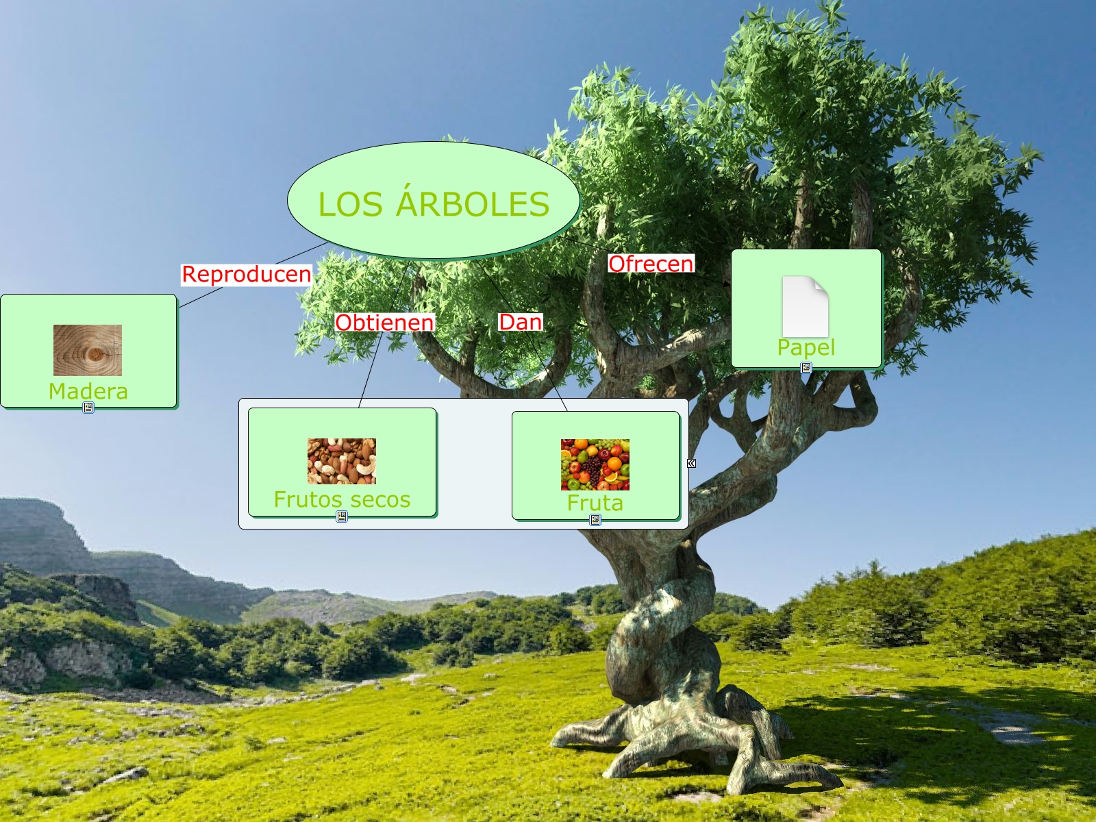 Este Cmap, tiene información relacionada con: Mapa conceptual- Los árboles 1, LOS ÁRBOLES Obtienen Frutos secos, LOS ÁRBOLES Ofrecen Papel, LOS ÁRBOLES Dan Fruta, LOS ÁRBOLES Reproducen Madera
