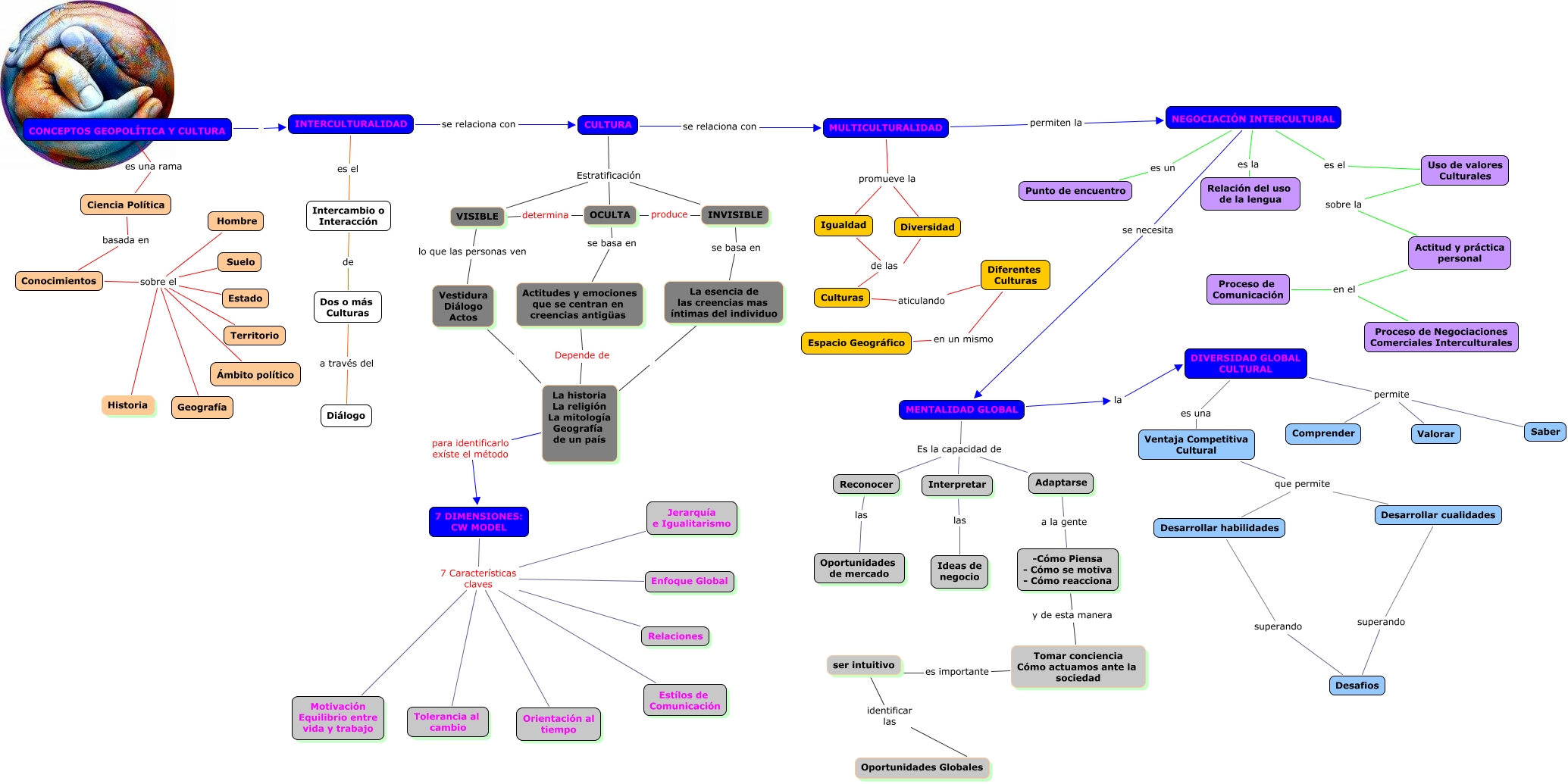 Este Cmap, tiene información relacionada con: Conceptos Geopolítica y Cultura1, Diferentes Culturas en un mismo Espacio Geográfico, Actitud y práctica personal en el Proceso de Comunicación, 7 DIMENSIONES: CW MODEL 7 Características claves Relaciones, 7 DIMENSIONES: CW MODEL 7 Características claves Jerarquía e Igualitarismo, Actitud y práctica personal en el Proceso de Negociaciones Comerciales Interculturales, Culturas aticulando Diferentes Culturas, NEGOCIACIÓN INTERCULTURAL es el Uso de valores Culturales, Conocimientos sobre el Historia, CULTURA Estratificación VISIBLE, Desarrollar habilidades superando Desafios, 7 DIMENSIONES: CW MODEL 7 Características claves Enfoque Global, CULTURA se relaciona con MULTICULTURALIDAD, 7 DIMENSIONES: CW MODEL 7 Características claves Motivación Equilibrio entre vida y trabajo, DIVERSIDAD GLOBAL CULTURAL permite Saber, Conocimientos sobre el Geografía, Reconocer las Oportunidades de mercado, Interpretar las Ideas de negocio, Conocimientos sobre el Suelo, Desarrollar cualidades superando Desafios, CONCEPTOS GEOPOLÍTICA Y CULTURA es una rama Ciencia Política