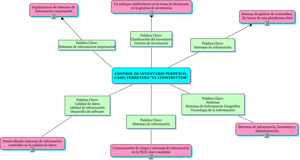Este Cmap, tiene información relacionada con: MAPA CONCEPTUAL DEL PROYECTO, CONTROL DE INVENTARIO PERPETUO, CASO: FERRETERA "EL CONSTRUCTOR" Palabra Clave: Sistemas Sistemas de Información Geográfica Tecnología de la Información Sistemas de información, Geomática y Administración, CONTROL DE INVENTARIO PERPETUO, CASO: FERRETERA "EL CONSTRUCTOR" Palabra Clave: Calidad de datos calidad de información desarrollo de software Desarrollando sistemas de información centrados en la calidad de datos, CONTROL DE INVENTARIO PERPETUO, CASO: FERRETERA "EL CONSTRUCTOR" Palabra Clave: Sistemas de información Sistema de gestion de contenidos: En busca de una plataforma ideal, CONTROL DE INVENTARIO PERPETUO, CASO: FERRETERA "EL CONSTRUCTOR" Palabra Clave: Sistemas de información Comunicación de riesgo y sistemas de información en la Web: cinco modelos, CONTROL DE INVENTARIO PERPETUO, CASO: FERRETERA "EL CONSTRUCTOR" Palabra Clave: Clasificaciôn del inventario Gestión de inventarios Un enfoque multicriterio en la toma de decisiones en la gestion de inventarios, CONTROL DE INVENTARIO PERPETUO, CASO: FERRETERA "EL CONSTRUCTOR" Palabra Clave: Sistemas de informacion empresarial Implantacion de sistemas de informacion empresarial