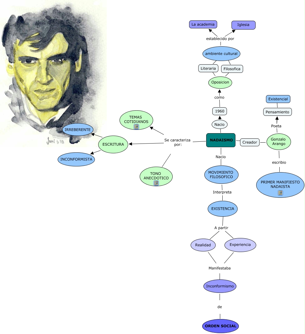 Este Cmap, tiene información relacionada con: Diana Gil, Oposicion ???? Literaria, NADAISMO Se caracteriza por: TONO ANECDOTICO, Gonzalo Arango Poeta Pensamiento, Filosofica ???? ambiente cultural, ESCRITURA ???? INCONFORMISTA, Inconformismo de ORDEN SOCIAL, Existencia A partir Realidad, ambiente cultural establecido por Iglesia, ESCRITURA ???? IRREBERENTE, Literaria ???? ambiente cultural, ambiente cultural establecido por La academia, 1960 como Oposicion, Gonzalo Arango escribio PRIMER MANIFIESTO NADAISTA, NADAISMO Se caracteriza por: ESCRITURA, Existencia A partir Experiencia, Gonzalo Arango Poeta Pensamiento, Pensamiento ???? Existencial, Experiencia Manifestaba Inconformismo, NADAISMO ???? Creador, Creador Gonzalo Arango