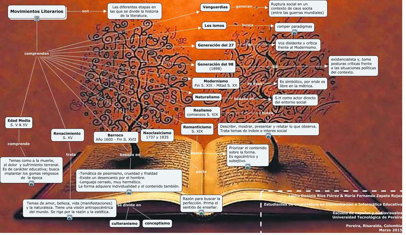 Este Cmap, tiene información relacionada con: Movimientos Literarios, Edad Media S. V & XV comprende Temas como a la muerte, el dolor y sufrimiento terrenal. Es de carácter educativa; busca implantar los gomas religiosos de la época, Naoclasicismo 1737 y 1835 parte Razón para buscar la perfección. Prima el sentido de enseñar., Generación del 27 fue Voz disidente y crítica frente al Modernismo., Movimientos Literarios comprenden Barroco Año 1600 - Fin S. XVII, Renacimiento S. XV trata Temas de amor, belleza, vida (manifestaciones) y la naturaleza. Tiene una visión antropocéntrica del mundo. Se rige por la razón y la estética., Movimientos Literarios comprenden Los ismos, Generación del 98 (1898) es existencialista y, toma posturas críticas frente a las situaciones políticas del contexto., Movimientos Literarios son Las diferentes etapas en las que se divide la historia de la literatura., Movimientos Literarios comprenden Generación del 27, Movimientos Literarios comprenden Realismo comienzos S. XIX, Realismo comienzos S. XIX busca Describir, mostrar, presentar y relatar lo que observa. Trata temas de índole e interes social, Barroco Año 1600 - Fin S. XVII basado en -Temática de pesimismo, crueldad y frialdad -Existe un desencanto por el hombre. -Lenguaje cerrado, muy hermético. La forma adquiere individualidad y el contenido también., Movimientos Literarios comprenden Naturalismo, Movimientos Literarios comprenden Modernismo Fin S. XIX - Mitad S. XX, Movimientos Literarios comprenden Romanticismo S. XIX, -Temática de pesimismo, crueldad y frialdad -Existe un desencanto por el hombre. -Lenguaje cerrado, muy hermético. La forma adquiere individualidad y el contenido también. se divide en conceptismo, Romanticismo S. XIX busca Priorizar el contenido sobre la forma. Es egocéntrico y subejtivo., Naturalismo basado en S.H como actor directo del entorno social, Movimientos Literarios comprenden Vanguardias, Los ismos busca romper paradigmas