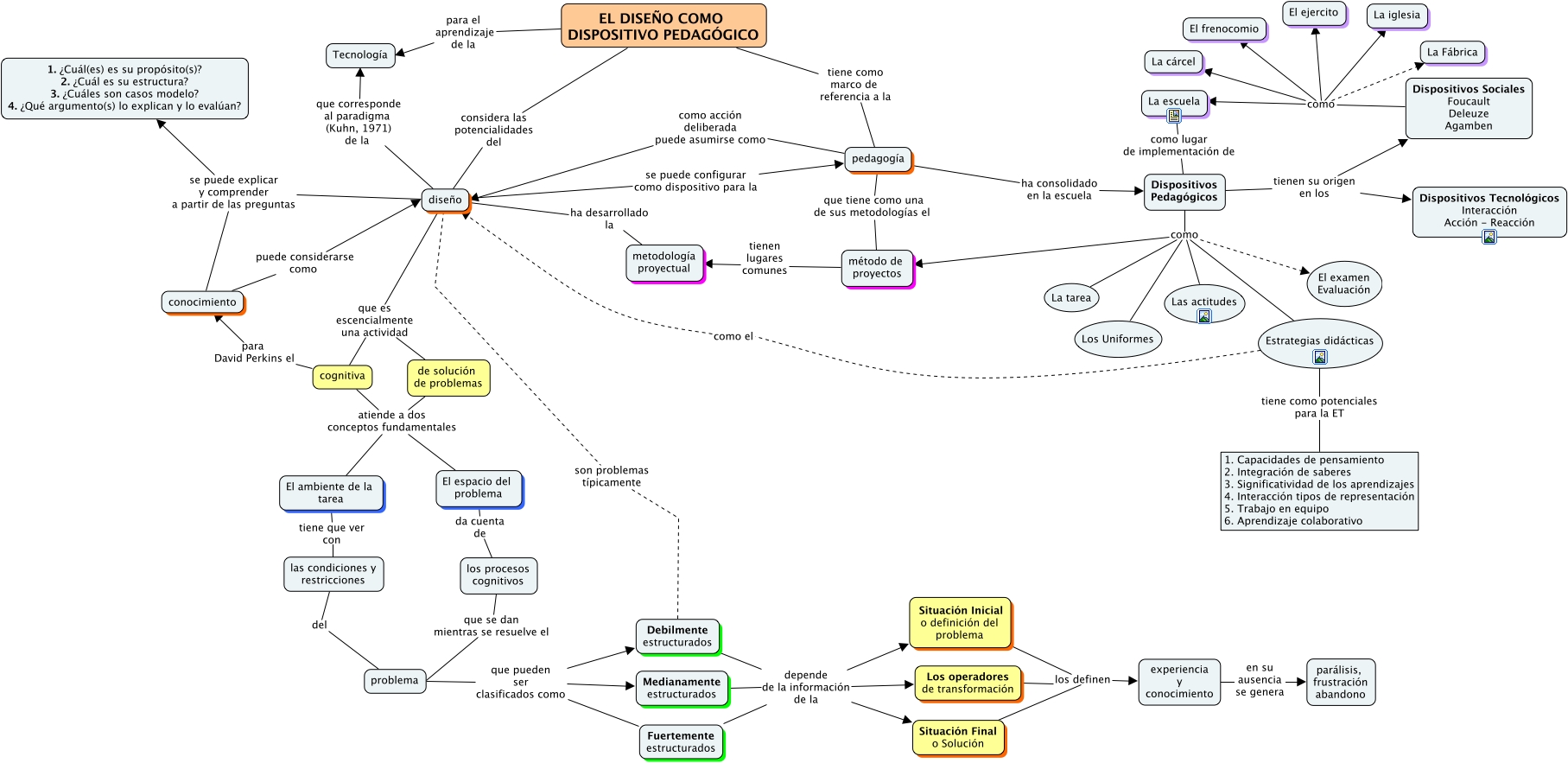 Este Cmap, tiene información relacionada con: Unidad 3 EL DISEÑO COMO DISPOSITIVO PEDAGÓGICO, Dispositivos Pedagógicos como Estrategias didácticas, problema que pueden ser clasificados como Medianamente estructurados, Situación Final o Solución los definen experiencia y conocimiento, experiencia y conocimiento en su ausencia se genera parálisis, frustración abandono, EL DISEÑO COMO DISPOSITIVO PEDAGÓGICO para el aprendizaje de la Tecnología, pedagogía que tiene como una de sus metodologías el método de proyectos, Dispositivos Pedagógicos tienen su origen en los Dispositivos Sociales Foucault Deleuze Agamben, Dispositivos Pedagógicos como método de proyectos, Debilmente estructurados depende de la información de la Situación Final o Solución, cognitiva atiende a dos conceptos fundamentales El espacio del problema, La escuela como lugar de implementación de Dispositivos Pedagógicos, Dispositivos Pedagógicos como Los Uniformes, cognitiva para David Perkins el conocimiento, Dispositivos Sociales Foucault Deleuze Agamben como La Fábrica, Dispositivos Sociales Foucault Deleuze Agamben como El ejercito, Medianamente estructurados depende de la información de la Los operadores de transformación, pedagogía como acción deliberada puede asumirse como diseño, diseño se puede configurar como dispositivo para la pedagogía, diseño son problemas típicamente Debilmente estructurados, de solución de problemas atiende a dos conceptos fundamentales El ambiente de la tarea