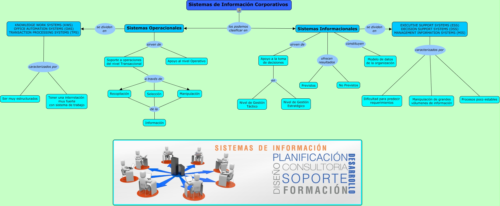 Este Cmap, tiene información relacionada con: Sistemas de Información Corporativos, Sistemas de Información Corporativos los podemos clasificar en Sistemas Informacionales, KNOWLEDGE WORK SYSTEMS (KWS) OFFICE AUTOMATION SYSTEMS (OAS) TRANSACTION PROCESSING SYSTEMS (TPS) caracterizados por Ser muy estructurados, Sistemas Informacionales ofrecen resultados No Previstos, Soporte a operaciones del nivel Transaccional a través de Manipulación, Soporte a operaciones del nivel Transaccional a través de Recopilación, Sistemas de Información Corporativos los podemos clasificar en Sistemas Operacionales, KNOWLEDGE WORK SYSTEMS (KWS) OFFICE AUTOMATION SYSTEMS (OAS) TRANSACTION PROCESSING SYSTEMS (TPS) caracterizados por Tener una interrelación muy fuerte con sistema de trabajo, Apoyo a la toma de decisiones en Nivel de Gestión Táctico, Sistemas Operacionales se dividen en KNOWLEDGE WORK SYSTEMS (KWS) OFFICE AUTOMATION SYSTEMS (OAS) TRANSACTION PROCESSING SYSTEMS (TPS), Sistemas Informacionales se dividen en EXECUTIVE SUPPORT SYSTEMS (ESS) DECISION SUPPORT SYSTEMS (DSS) MANAGEMENT INFORMATION SYSTEMS (MIS), EXECUTIVE SUPPORT SYSTEMS (ESS) DECISION SUPPORT SYSTEMS (DSS) MANAGEMENT INFORMATION SYSTEMS (MIS) caracterizados por Procesos poco estables, EXECUTIVE SUPPORT SYSTEMS (ESS) DECISION SUPPORT SYSTEMS (DSS) MANAGEMENT INFORMATION SYSTEMS (MIS) caracterizados por Manipulación de grandes vólumenes de información, EXECUTIVE SUPPORT SYSTEMS (ESS) DECISION SUPPORT SYSTEMS (DSS) MANAGEMENT INFORMATION SYSTEMS (MIS) caracterizados por Dificultad para predecir requerimientos, Sistemas Operacionales sirven de Apoyo al nivel Operativo, Soporte a operaciones del nivel Transaccional a través de Selección, Recopilación de la Información, Apoyo a la toma de decisiones en Nivel de Gestión Estratégico, Sistemas Informacionales ofrecen resultados Previstos, Sistemas Operacionales sirven de Soporte a operaciones del nivel Transaccional, Manipulación de la Información