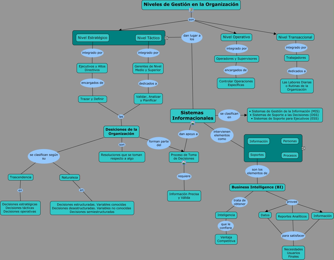 Este Cmap, tiene información relacionada con: Sistemas Informacionales, Desiciones de la Organización se clasifican según su Naturaleza, Gerentes de Nivel Medio y Superior dedicados a Validar, Analizar y Planificar, Business Intelligence (BI) provee Datos, Operadores y Supervisores encargados de Controlar Operaciones Específicas, ???? dan lugar a los Sistemas Informacionales, Datos para satisfacer Necesidades Usuarios Finales, Business Intelligence (BI) provee Información, Sistemas Informacionales se clasifican en • Sistemas de Gestión de la Información (MIS) • Sistemas de Soporte a las Decisiones (DSS) • Sistemas de Soporte para Ejecutivos (ESS), Reportes Analíticos para satisfacer Necesidades Usuarios Finales, Proceso de Toma de Decisiones requiere Información Precisa y Válida, Trascendencia en Decisiones estratégicas Decisiones tácticas Decisiones operativas, Naturaleza en Decisiones estructuradas. Variables conocidas Decisiones desestructuradas. Variables no conocidas Decisiones semiestructuradas, Business Intelligence (BI) trata de obtener Inteligencia, Trazar y Definir las Desiciones de la Organización, Trabajadores dedicados a Las Labores Diarias o Rutinas de la Organización, Niveles de Gestión en la Organización son Nivel Operativo, Sistemas Informacionales intervienen elementos como ????, Nivel Táctico integrado por Gerentes de Nivel Medio y Superior, Inteligencia que le confiera Ventaja Competitiva, Desiciones de la Organización son Resoluciones que se toman respecto a algo
