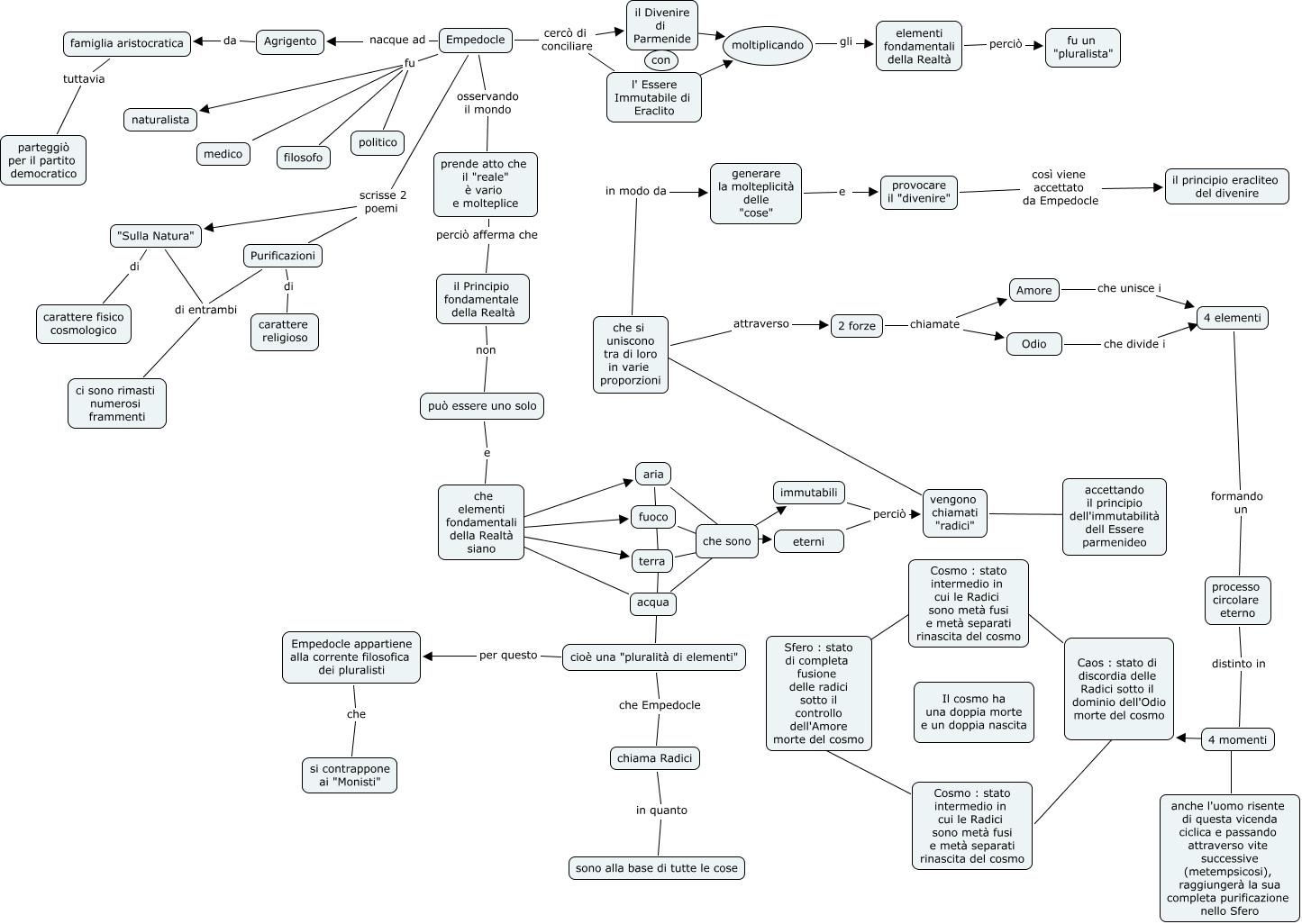 Questa Cmap, creata con IHMC CmapTools, contiene informazioni relative a: Empedocle, 2 forze chiamate Odio, cioè una "pluralità di elementi" per questo Empedocle appartiene alla corrente filosofica dei pluralisti, Caos : stato di discordia delle Radici sotto il dominio dell'Odio morte del cosmo ???? Cosmo : stato intermedio in cui le Radici sono metà fusi e metà separati rinascita del cosmo, Empedocle nacque ad Agrigento, terra ???? che sono, Sfero : stato di completa fusione delle radici sotto il controllo dell'Amore morte del cosmo ???? ????, "Sulla Natura" di entrambi ci sono rimasti numerosi frammenti, prende atto che il "reale" è vario e molteplice perciò afferma che il Principio fondamentale della Realtà, Cosmo : stato intermedio in cui le Radici sono metà fusi e metà separati rinascita del cosmo ???? Sfero : stato di completa fusione delle radici sotto il controllo dell'Amore morte del cosmo, Amore che unisce i 4 elementi, che elementi fondamentali della Realtà siano ???? terra, chiama Radici in quanto sono alla base di tutte le cose, Odio che divide i ????, acqua ???? che sono, Purificazioni di entrambi ci sono rimasti numerosi frammenti, aria ???? cioè una "pluralità di elementi", Empedocle fu medico, vengono chiamati "radici" ???? che si uniscono tra di loro in varie proporzioni, che elementi fondamentali della Realtà siano ???? fuoco, Empedocle scrisse 2 poemi Purificazioni