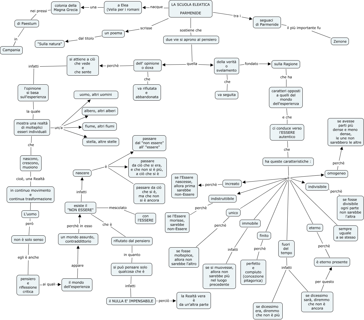 Questa Cmap, creata con IHMC CmapTools, contiene informazioni relative a: Parmenide, indivisibile perchè se fosse divisibile ogni parte non sarebbe l'altra, caratteri opposti a quelli del mondo dell'esperienza e che ci conduce verso l'ESSERE autentico, ha queste caratteristiche : è indistruttibile, si attiene a ciò che vede e che sente infatti l'opinione si basa sull'esperienza, LA SCUOLA ELEATICA PARMENIDE tra i seguaci di Parmenide, esiste il "NON ESSERE" mescolato con l'ESSERE, mostra una realtà di molteplici esseri individuali che nascono, crescono, muoiono, increato perchè se l'Essere nascesse, allora prima sarebbe non-Essere, ha queste caratteristiche : è unico, LA SCUOLA ELEATICA PARMENIDE sostiene che due vie si aprono al pensiero, a Elea (Velia per i romani una colonia della Magna Grecia, nascere è passare da ciò che si era, e che non si è più, a ciò che si è, pensiero e riflessione critica ai quali il mondo dell'esperienza, nascere è passare da ciò che si è, ma che non si è ancora, mostra una realtà di molteplici esseri individuali un/a uomo, altri uomini, omogeneo perchè se avesse parti più dense e meno dense, le une non sarebbero le altre, LA SCUOLA ELEATICA PARMENIDE scrisse un poema, ha queste caratteristiche : è indivisibile, finito perchè perfetto e compiuto (concezione pitagorica), mostra una realtà di molteplici esseri individuali un/a stella, altre stelle