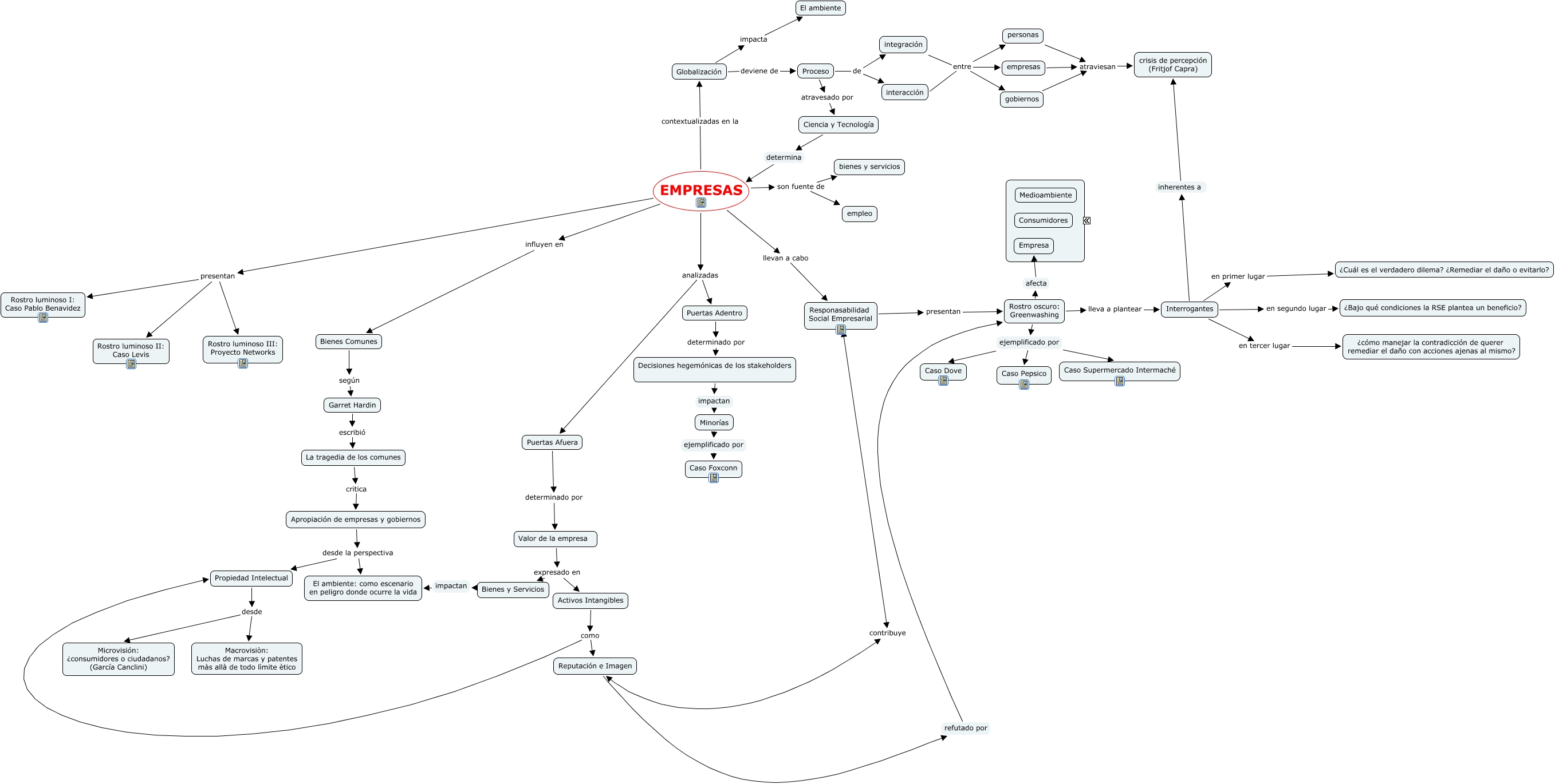Este Cmap, tiene información relacionada con: Presentacion final, Garret Hardin escribió La tragedia de los comunes, Reputación e Imagen contribuye Responasabilidad Social Empresarial, gobiernos atraviesan crisis de percepción (Fritjof Capra), Apropiación de empresas y gobiernos desde la perspectiva Propiedad Intelectual, Activos Intangibles como Reputación e Imagen, Interrogantes en segundo lugar ¿Bajo qué condiciones la RSE plantea un beneficio?, Globalización deviene de Proceso, Proceso de interacción, Minorías ejemplificado por Caso Foxconn, Interrogantes en tercer lugar ¿cómo manejar la contradicción de querer remediar el daño con acciones ajenas al mismo?, Rostro oscuro: Greenwashing ejemplificado por Caso Pepsico, Activos Intangibles como Propiedad Intelectual, Puertas Adentro determinado por Decisiones hegemónicas de los stakeholders, Globalización impacta El ambiente, Apropiación de empresas y gobiernos desde la perspectiva El ambiente: como escenario en peligro donde ocurre la vida, EMPRESAS son fuente de bienes y servicios, empresas atraviesan crisis de percepción (Fritjof Capra), Valor de la empresa expresado en Activos Intangibles, EMPRESAS influyen en Bienes Comunes, Bienes Comunes según Garret Hardin