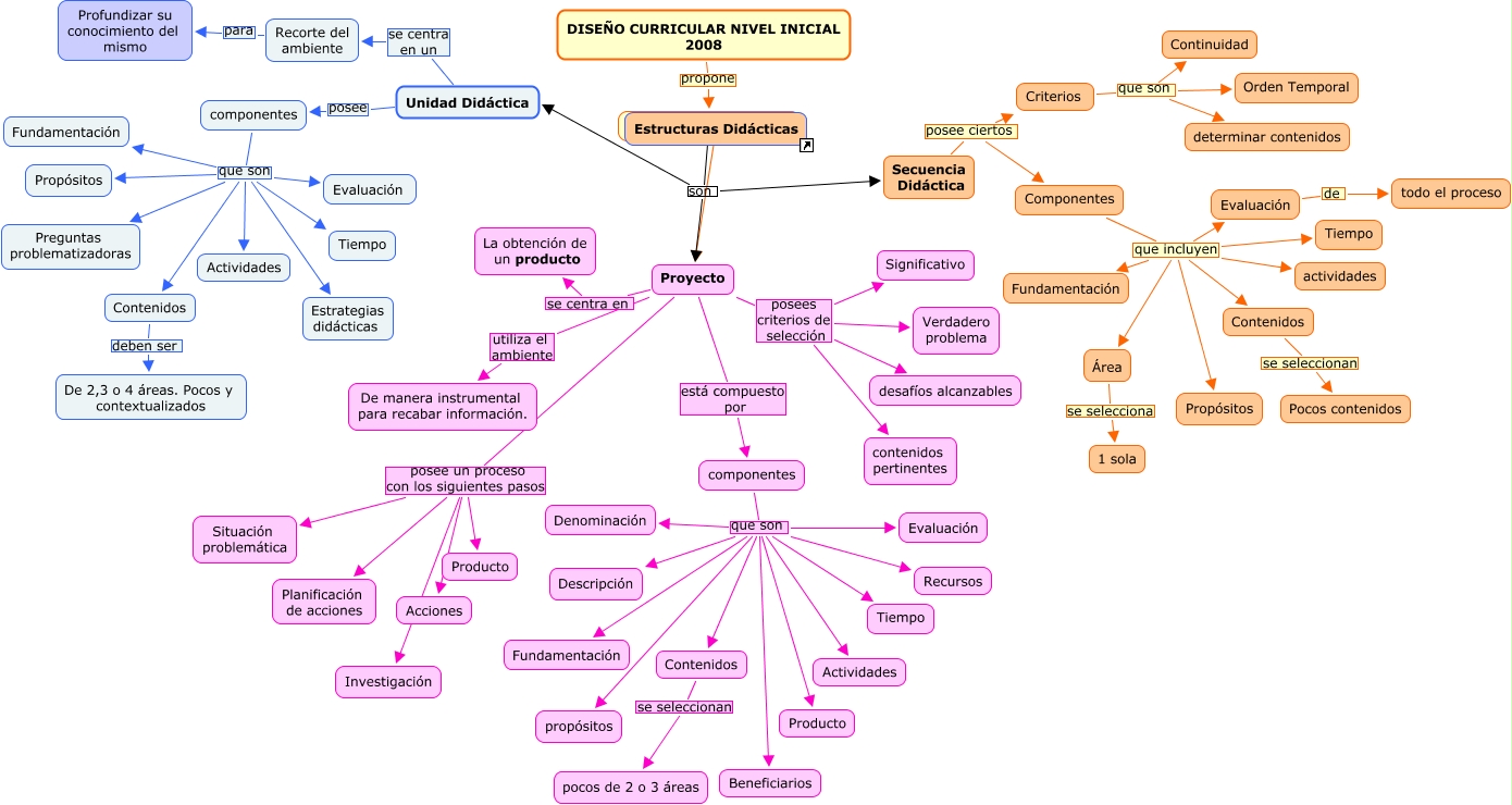 Este Cmap, tiene información relacionada con: Estructuras didácticas, Proyecto y Secuencias Didácticas, Criterios que son Orden Temporal, componentes que son Tiempo, componentes que son Contenidos, Estructuras Didácticas ???? Proyecto, Contenidos se seleccionan Pocos contenidos, componentes que son Fundamentación, Componentes que incluyen Fundamentación, Contenidos se seleccionan pocos de 2 o 3 áreas, Secuencia Didáctica posee ciertos Criterios, componentes que son Producto, Proyecto posee un proceso con los siguientes pasos Situación problemática, DISEÑO CURRICULAR NIVEL INICIAL 2008 propone Estructuras Didácticas, Componentes que incluyen Evaluación, Proyecto posees criterios de selección Significativo, Componentes que incluyen actividades, componentes que son Descripción, Proyecto se centra en La obtención de un producto, componentes que son Evaluación, Unidad Didáctica se centra en un Recorte del ambiente, Componentes que incluyen Área