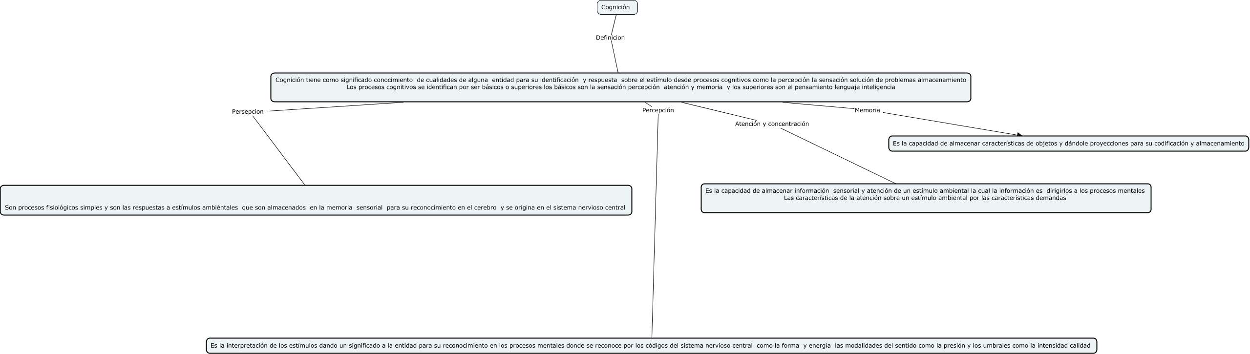 Este Cmap, tiene información relacionada con: Cognición, Cognición tiene como significado conocimiento de cualidades de alguna entidad para su identificación y respuesta sobre el estímulo desde procesos cognitivos como la percepción la sensación solución de problemas almacenamiento Los procesos cognitivos se identifican por ser básicos o superiores los básicos son la sensación percepción atención y memoria y los superiores son el pensamiento lenguaje inteligencia Persepcion Son procesos fisiológicos simples y son las respuestas a estímulos ambiéntales que son almacenados en la memoria sensorial para su reconocimiento en el cerebro y se origina en el sistema nervioso central, Cognición tiene como significado conocimiento de cualidades de alguna entidad para su identificación y respuesta sobre el estímulo desde procesos cognitivos como la percepción la sensación solución de problemas almacenamiento Los procesos cognitivos se identifican por ser básicos o superiores los básicos son la sensación percepción atención y memoria y los superiores son el pensamiento lenguaje inteligencia Percepción Es la interpretación de los estímulos dando un significado a la entidad para su reconocimiento en los procesos mentales donde se reconoce por los códigos del sistema nervioso central como la forma y energía las modalidades del sentido como la presión y los umbrales como la intensidad calidad, Cognición Definicion Cognición tiene como significado conocimiento de cualidades de alguna entidad para su identificación y respuesta sobre el estímulo desde procesos cognitivos como la percepción la sensación solución de problemas almacenamiento Los procesos cognitivos se identifican por ser básicos o superiores los básicos son la sensación percepción atención y memoria y los superiores son el pensamiento lenguaje inteligencia, Cognición tiene como significado conocimiento de cualidades de alguna entidad para su identificación y respuesta sobre el estímulo desde procesos cognitivos como la percepción la sensación solución de problemas almacenamiento Los procesos cognitivos se identifican por ser básicos o superiores los básicos son la sensación percepción atención y memoria y los superiores son el pensamiento lenguaje inteligencia Memoria Es la capacidad de almacenar características de objetos y dándole proyecciones para su codificación y almacenamiento, Cognición tiene como significado conocimiento de cualidades de alguna entidad para su identificación y respuesta sobre el estímulo desde procesos cognitivos como la percepción la sensación solución de problemas almacenamiento Los procesos cognitivos se identifican por ser básicos o superiores los básicos son la sensación percepción atención y memoria y los superiores son el pensamiento lenguaje inteligencia Atención y concentración Es la capacidad de almacenar información sensorial y atención de un estímulo ambiental la cual la información es dirigirlos a los procesos mentales Las características de la atención sobre un estímulo ambiental por las características demandas