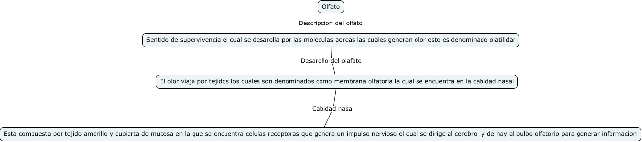 Este Cmap, tiene información relacionada con: olfato, Sentido de supervivencia el cual se desarolla por las moleculas aereas las cuales generan olor esto es denominado olatilidar Desarollo del olafato El olor viaja por tejidos los cuales son denominados como membrana olfatoria la cual se encuentra en la cabidad nasal, El olor viaja por tejidos los cuales son denominados como membrana olfatoria la cual se encuentra en la cabidad nasal Cabidad nasal Esta compuesta por tejido amarillo y cubierta de mucosa en la que se encuentra celulas receptoras que genera un impulso nervioso el cual se dirige al cerebro y de hay al bulbo olfatorio para generar informacion, Olfato Descripcion del olfato Sentido de supervivencia el cual se desarolla por las moleculas aereas las cuales generan olor esto es denominado olatilidar