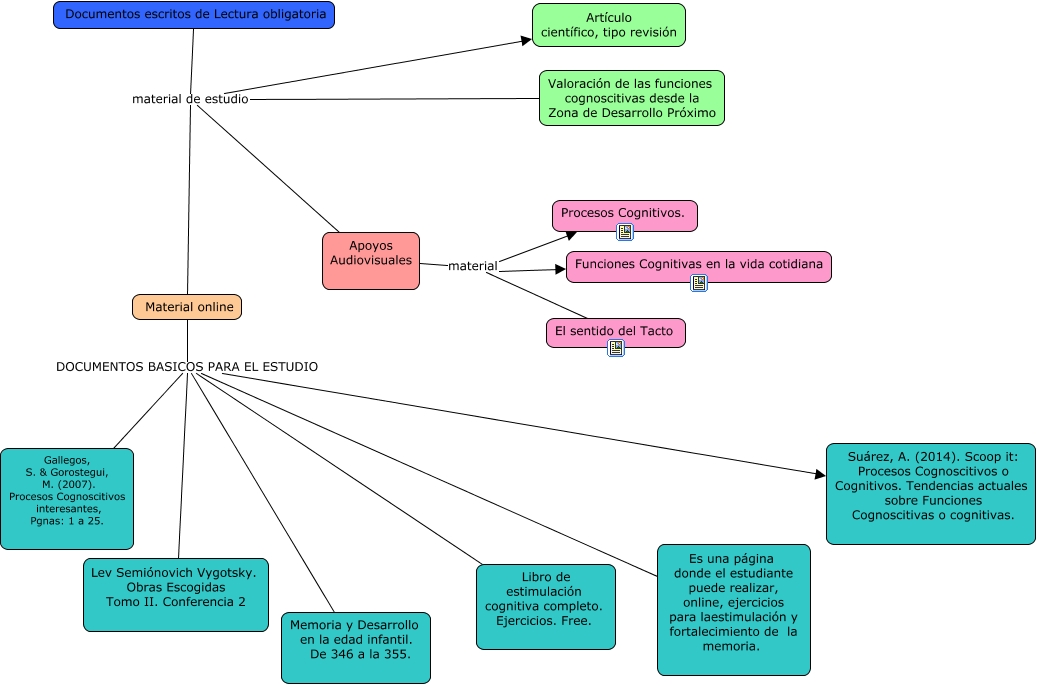 Este Cmap, tiene información relacionada con: DOCUMENTOS ESCRITOS DE LECTURAS OBLIGATORIAS, Valoración de las funciones cognoscitivas desde la Zona de Desarrollo Próximo material de estudio Artículo científico, tipo revisión, Documentos escritos de Lectura obligatoria material de estudio Artículo científico, tipo revisión, Material online DOCUMENTOS BASICOS PARA EL ESTUDIO Libro de estimulación cognitiva completo. Ejercicios. Free., Material online DOCUMENTOS BASICOS PARA EL ESTUDIO Es una página donde el estudiante puede realizar, online, ejercicios para laestimulación y fortalecimiento de la memoria., Apoyos Audiovisuales material Procesos Cognitivos., Material online DOCUMENTOS BASICOS PARA EL ESTUDIO Suárez, A. (2014). Scoop it: Procesos Cognoscitivos o Cognitivos. Tendencias actuales sobre Funciones Cognoscitivas o cognitivas., Documentos escritos de Lectura obligatoria material de estudio Material online, Apoyos Audiovisuales material El sentido del Tacto, Documentos escritos de Lectura obligatoria material de estudio Apoyos Audiovisuales, Valoración de las funciones cognoscitivas desde la Zona de Desarrollo Próximo material de estudio Material online, Material online DOCUMENTOS BASICOS PARA EL ESTUDIO Memoria y Desarrollo en la edad infantil. De 346 a la 355., Material online DOCUMENTOS BASICOS PARA EL ESTUDIO Lev Semiónovich Vygotsky. Obras Escogidas Tomo II. Conferencia 2, Apoyos Audiovisuales material Funciones Cognitivas en la vida cotidiana, Valoración de las funciones cognoscitivas desde la Zona de Desarrollo Próximo material de estudio Apoyos Audiovisuales, Material online DOCUMENTOS BASICOS PARA EL ESTUDIO Gallegos, S. & Gorostegui, M. (2007). Procesos Cognoscitivos interesantes, Pgnas: 1 a 25.