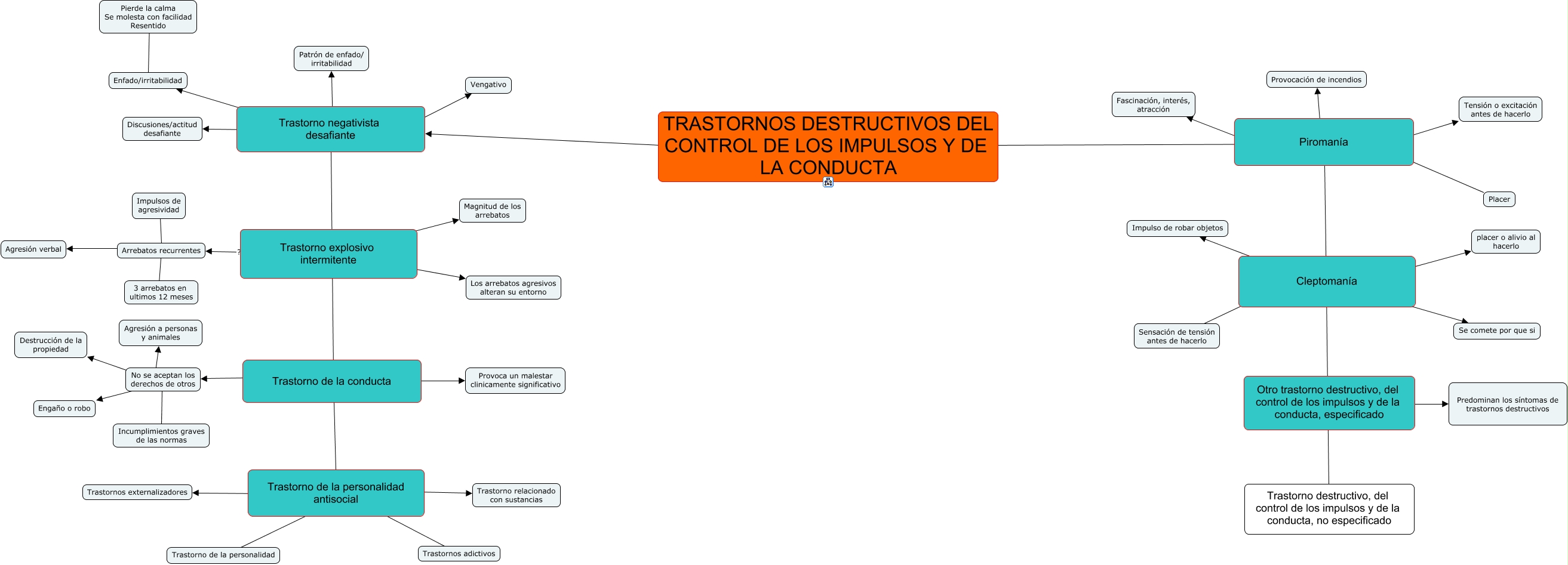 Este Cmap, tiene información relacionada con: Trastorno destructivo del control de los impulsos, NahielyTG, Trastorno de la conducta ???? Provoca un malestar clinicamente significativo, Trastorno de la personalidad antisocial ???? Trastorno relacionado con sustancias, Trastorno de la personalidad antisocial ???? Trastornos externalizadores, Piromanía ???? Provocación de incendios, Enfado/irritabilidad ???? Pierde la calma Se molesta con facilidad Resentido, Trastorno negativista desafiante ???? Vengativo, Cleptomanía ???? placer o alivio al hacerlo, Piromanía ???? Fascinación, interés, atracción, TRASTORNOS DESTRUCTIVOS DEL CONTROL DE LOS IMPULSOS Y DE LA CONDUCTA ???? Trastorno negativista desafiante, Piromanía ???? Trastorno destructivo, del control de los impulsos y de la conducta, no especificado, Cleptomanía ???? Impulso de robar objetos, Trastorno negativista desafiante ???? Enfado/irritabilidad, Arrebatos recurrentes ???? Agresión verbal, No se aceptan los derechos de otros ???? Incumplimientos graves de las normas, Trastorno negativista desafiante ???? Discusiones/actitud desafiante, Trastorno de la personalidad antisocial ???? Trastornos adictivos, Trastorno explosivo intermitente ???? Los arrebatos agresivos alteran su entorno, Piromanía ???? Placer, Cleptomanía ???? Sensación de tensión antes de hacerlo, No se aceptan los derechos de otros ???? Engaño o robo