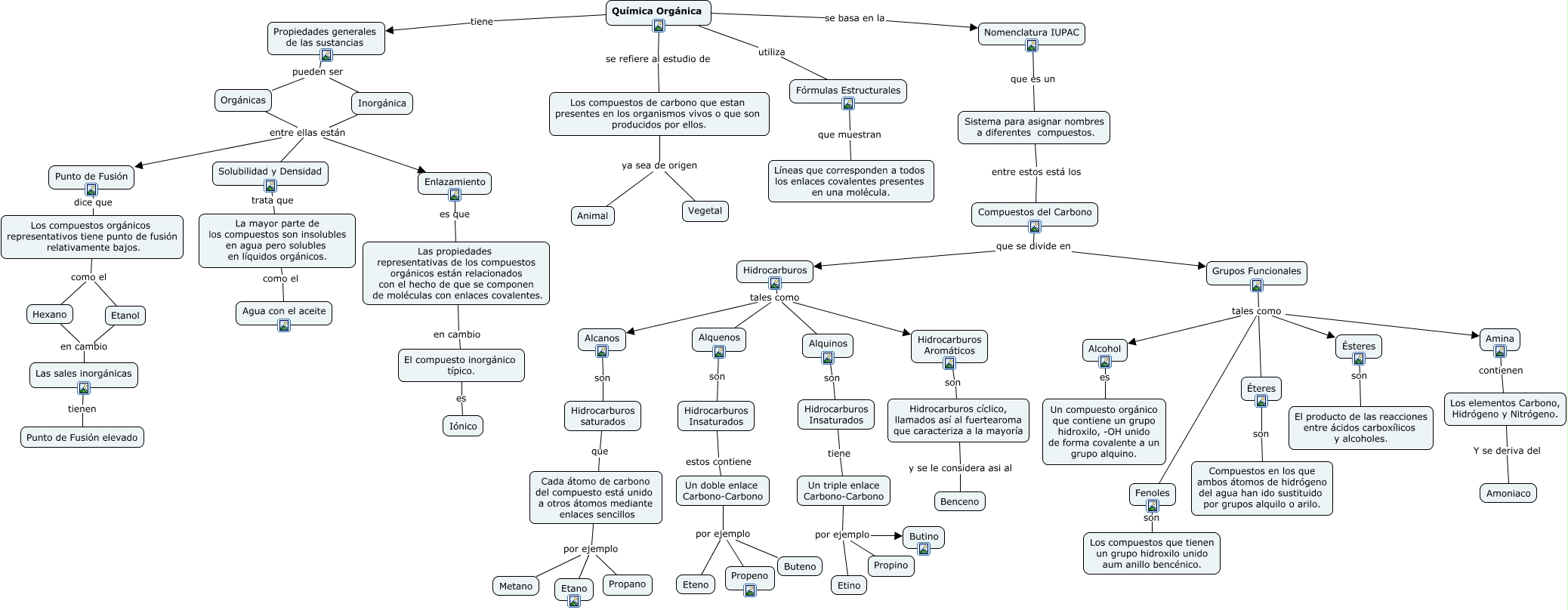 Este Cmap, tiene información relacionada con: Mapa de Química 12° M, Hidrocarburos tales como Alquinos, Propiedades generales de las sustancias pueden ser Inorgánica, Grupos Funcionales tales como Éteres, Compuestos del Carbono que se divide en Grupos Funcionales, Los compuestos de carbono que estan presentes en los organismos vivos o que son producidos por ellos. ya sea de origen Animal, Hidrocarburos Insaturados estos contiene Un doble enlace Carbono-Carbono, Grupos Funcionales tales como Fenoles, Hexano en cambio Las sales inorgánicas, Los compuestos orgánicos representativos tiene punto de fusión relativamente bajos. como el Etanol, Inorgánica entre ellas están Punto de Fusión, Hidrocarburos tales como Hidrocarburos Aromáticos, Un doble enlace Carbono-Carbono por ejemplo Propeno, El compuesto inorgánico típico. es Iónico, Las sales inorgánicas tienen Punto de Fusión elevado, Inorgánica entre ellas están Enlazamiento, Hidrocarburos Insaturados tiene Un triple enlace Carbono-Carbono, Hidrocarburos tales como Alquenos, Sistema para asignar nombres a diferentes compuestos. entre estos está los Compuestos del Carbono, Los compuestos orgánicos representativos tiene punto de fusión relativamente bajos. como el Hexano, Un doble enlace Carbono-Carbono por ejemplo Eteno