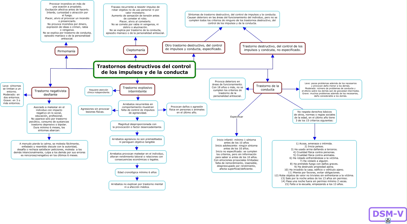 Este Cmap, tiene información relacionada con: 15 Trastornos destructivos del control de los impulsos y de la conducta, Trastorno explosivo intermitente ???? Requiere atención clínica independiente., Asociado a malestar en el individuo con impacto negativo en lo social, educación, profesional. No aparece sólo por trastorno psicótico, consumo de sustancias trastorno depresivo o bipolar. Dura mínimo 6 meses, los síntomas abarcan: ???? A menudo pierde la calma, se molesta fácilmente, enfadado y resentido discute con la autoridad, desafía o rechaza satisfacer peticiones, molesta a los demás intencionalmente, culpa a los demás por sus errores es rencoroso/vengativo en los últimos 6 meses., Otro trastorno destructivo, del control de impulsos y conducta, especificado. ???? Síntomas de trastorno destructivo, del control de impulsos y la conducta. Causan deterioro en las áreas del funcionamiento del individuo, pero no se cumplen todos los criterios de ninguno de los trastornos destructivo, del control de los impulsos y de la conducta., Arrebatos recurrentes en comportamiento muestran falta de control de impulsos de agresividad. ???? Magnitud desproporcionada con la provocación o factor desencadentante., Trastorno de la conducta ???? Provoca deterioro en áreas de funcionamiento. Con 18 años o más, no se cumplen los criterios de trastorno de la personalidad antisocial., Trastornos destructivos del control de los impulsos y de la conducta ???? Trastorno destructivo, del control de los impulsos y condcuta, no especificado., Trastorno de la conducta No respeta derechos básicos de otros, normas o reglas sociales de la edad, en el último año tiene 3 de los 15 criterios siguientes: 1) Acosa, amenaza o intimida. 2) Inicia peleas. 3) Ha usado arma dañando a terceros. 4) Crueldad física contra personas. 5) Crueldad física contra animales. 6) Ha robado enfrentándose a la víctima. 7) Ha violado a alguien. 8) Ha prendido fuego con daños graves. 9) Ha destruido propiedad ajena. 10) Ha invadido la casa, edificio o vehículo ajeno. 11) Miente por favores, evitar obligaciones. 12) Roba objetos de valor no triviales sin enfrentarse a la víctima. 13) Sale por la noche antes de los 13 años sin permiso. 14) Pasa una noche fuera sin permiso mínimo 2 veces. 15) Falta a la escuela, empezando a los 13 años., Trastornos destructivos del control de los impulsos y de la conducta ???? Otro trastorno destructivo, del control de impulsos y conducta, especificado., Arrebatos recurrentes en comportamiento muestran falta de control de impulsos de agresividad. ???? Prococan daños o agresión física en personas o animales en el último año., Trastorno negativista desfiante ???? Asociado a malestar en el individuo con impacto negativo en lo social, educación, profesional. No aparece sólo por trastorno psicótico, consumo de sustancias trastorno depresivo o bipolar. Dura mínimo 6 meses, los síntomas abarcan:, Trastorno destructivo, del control de los impulsos y condcuta, no especificado. ???? Síntomas de trastorno destructivo, del control de impulsos y la conducta. Causan deterioro en las áreas del funcionamiento del individuo, pero no se cumplen todos los criterios de ninguno de los trastornos destructivo, del control de los impulsos y de la conducta., Trastorno de la conducta ???? Leve: pocos problemas además de los necesarios y provocan daño menor a los demás. Moderado: número de problemas de conducta y el efecto sobre los demás son de gravedad intermedia. Grave: muchos problemas además de los necesarios, daño considerable a los demás., Magnitud desproporcionada con la provocación o factor desencadentante. ???? Arrebatos agresivos no son premeditados ni persiguen objetivo tangible, Trastornos destructivos del control de los impulsos y de la conducta ???? Pirmomanía, Trastornos destructivos del control de los impulsos y de la conducta ???? Cleptomanía, Trastornos destructivos del control de los impulsos y de la conducta ???? Trastorno de la conducta, Trastorno negativista desfiante ???? Leve: síntomas se limitan a un entorno. Moderado: en dos entornos. Grave: en 3 o más entornos., Trastornos destructivos del control de los impulsos y de la conducta ???? Trastorno negativista desfiante, Trastornos destructivos del control de los impulsos y de la conducta ???? Trastorno explosivo intermitente, Pirmomanía ???? Provocar incendios en más de una ocación a propósito. Excitación afectiva antes de hacerlo. Interés, curiosidad o atracción por el fuego. Placer, alivio al provocar un incendio o presenciarlo. No provoca incendios por dinero, expresión de ideas o crimen, rabia o venganza. No se explica por trastorno de conducta, episodio maníaco o de la personalidad antisocial.