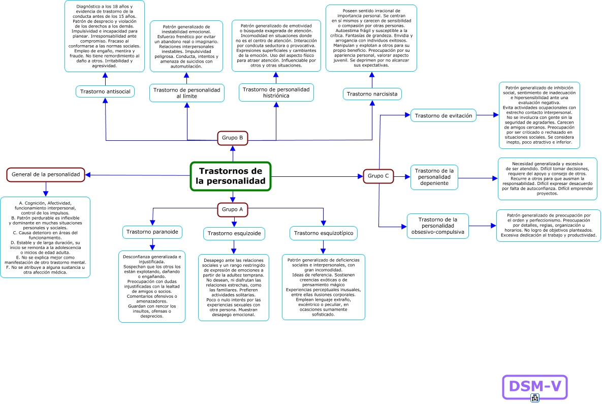 Este Cmap, tiene información relacionada con: 18 Trastornos de la personalidad, Trastorno paranoide ???? Desconfianza generalizada e injustificada. Sospechan que los otros los están explotando, dañando o engañando. Preocupación con dudas injustificadas con la lealtad de amigos o socios. Comentarios ofensivos o amenazadores. Guardan con rencor los insultos, ofensas o desprecios., Grupo B ???? Trastorno narcisista, Trastorno de evitación ???? Patrón generalizado de inhibición social, sentimiento de inadecuación e hipersensibilidad ante una evaluación negativa. Evita actividades ocupacionales con estrecho contacto interpersonal. No se involucra con gente sin la seguridad de agradarles. Carecen de amigos cercanos. Preocupación por ser criticado o rechazado en situaciones sociales. Se considera inepto, poco atractivo e inferior., Trastornos de la personalidad ???? Grupo B, Grupo C ???? Trastorno de la personalidad obsesivo-compulsiva, Grupo B ???? Trastorno antisocial, Trastornos de la personalidad ???? General de la personalidad, Trastorno de la personalidad depeniente ???? Necesidad generalizada y escesiva de ser atendido. Difícil tomar decisiones, requiere del apoyo y consejo de otros. Recurre a otros para que ausman la responsabilidad. Difícil expresar desacuerdo por falta de autoconfianza. Difícil emprender proyectos., Grupo C ???? Trastorno de la personalidad depeniente, Trastorno de la personalidad obsesivo-compulsiva ???? Patrón generalizado de preocupación por el orden y perfeccionismo. Preocupación por detalles, reglas, organización u horarios. No logro de objetivos planteados. Excesiva dedicación al trabajo y productividad., Trastorno antisocial ???? Diagnóstico a los 18 años y evidencia de trastorno de la conducta antes de los 15 años. Patrón de desprecio y violación de los derechos a los demás. Impulsividad e incapacidad para planear. Irresponsabilidad ante compromiso. Fracaso al conformarse a las normas sociales. Empleo de engaño, mentira y fraude. No tiene remordimiento al daño a otros. Irritabilidad y agresividad., Grupo A ???? Trastorno esquizoide, Trastorno narcisista ???? Poseen sentido irracional de importancia personal. Se centran en sí mismos y carecen de sensibilidad o compasión por otras personas. Autoestima frágil y susceptible a la crítica. Fantasías de grandeza. Envidia y arrogancia con individuos exitosos. Manipulan y explotan a otros para su propio beneficio. Preocupación por su apariencia personal, valorar aspecto juvenil. Se deprimen por no alcanzar sus expectativas., Grupo A ???? Trastorno esquizotípico, Trastornos de la personalidad ???? Grupo C, Grupo B ???? Trastorno de personalidad al límite, Grupo A ???? Trastorno paranoide, General de la personalidad ???? A. Cognición, Afectividad, funcionamiento interpersonal, control de los impulsos. B. Patrón perdurable es inflexible y dominante en muchas situaciones personales y sociales. C. Causa deterioro en áreas del funcionamiento. D. Estable y de larga duración, su inicio se remonta a la adolescencia o inicios de edad adulta. E. No se explica mejor como manifestación de otro trastorno mental. F. No se atribuye a alguna sustancia u otra afección médica., Trastorno de personalidad al límite ???? Patrón generalizado de inestabilidad emocional. Esfuerzo frenético por evitar un abandono real o imaginario. Relaciones interpersonales inestables. Impulsividad peligrosa. Conducta, intentos y amenaza de suicidios con automutilación., Trastorno esquizoide ???? Desapego ante las relaciones sociales y un rango restringido de expresión de emociones a partir de la adultez temprana. No desean, ni disfrutan las relaciones estrechas, como las familiares. Prefieren actividades solitarias. Poco o nulo interés por las experiencias sexuales con otra persona. Muestran desapego emocional.