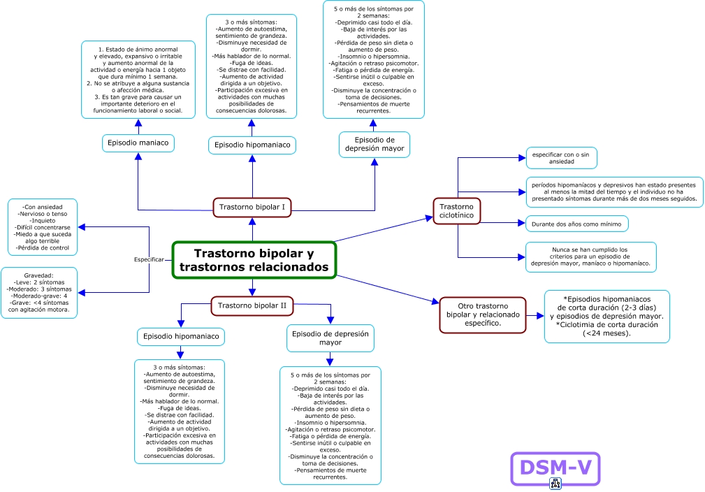 Este Cmap, tiene información relacionada con: 3 Trastorno bipolar y trastornos relacionados, Episodio de depresión mayor ???? 5 o más de los síntomas por 2 semanas: -Deprimido casi todo el día. -Baja de interés por las actividades. -Pérdida de peso sin dieta o aumento de peso. -Insomnio o hipersomnia. -Agitación o retraso psicomotor. -Fatiga o pérdida de energía. -Sentirse inútil o culpable en exceso. -Disminuye la concentración o toma de decisiones. -Pensamientos de muerte recurrentes., Trastorno bipolar y trastornos relacionados ???? Trastorno bipolar I, Otro trastorno bipolar y relacionado específico. ???? *Episodios hipomaniacos de corta duración (2-3 días) y episodios de depresión mayor. *Ciclotimia de corta duración (ឈ meses)., Trastorno bipolar y trastornos relacionados Especificar Gravedad: -Leve: 2 síntomas -Moderado: 3 síntomas -Moderado-grave: 4 -Grave: ɜ síntomas con agitación motora., Trastorno bipolar I ???? Episodio maniaco, Trastorno bipolar I ???? Episodio hipomaniaco, Trastorno bipolar I ???? Episodio de depresión mayor, Trastorno ciclotínico ???? Durante dos años como mínimo, Trastorno bipolar y trastornos relacionados ???? Otro trastorno bipolar y relacionado específico., Trastorno bipolar II ???? Episodio hipomaniaco, Episodio hipomaniaco ???? 3 o más síntomas: -Aumento de autoestima, sentimiento de grandeza. -Disminuye necesidad de dormir. -Más hablador de lo normal. -Fuga de ideas. -Se distrae con facilidad. -Aumento de actividad dirigida a un objetivo. -Participación excesiva en actividades con muchas posibilidades de consecuencias dolorosas., Trastorno bipolar II ???? Episodio de depresión mayor, Trastorno ciclotínico ???? períodos hipomaníacos y depresivos han estado presentes al menos la mitad del tiempo y el individuo no ha presentado síntomas durante más de dos meses seguidos., Episodio maniaco ???? 1. Estado de ánimo anormal y elevado, expansivo o irritable y aumento anormal de la actividad o energía hacia 1 objeto que dura mínimo 1 semana. 2. No se atribuye a alguna sustancia o afección médica. 3. Es tan grave para causar un importante deterioro en el funcionamiento laboral o social., Episodio hipomaniaco ???? 3 o más síntomas: -Aumento de autoestima, sentimiento de grandeza. -Disminuye necesidad de dormir. -Más hablador de lo normal. -Fuga de ideas. -Se distrae con facilidad. -Aumento de actividad dirigida a un objetivo. -Participación excesiva en actividades con muchas posibilidades de consecuencias dolorosas., Trastorno ciclotínico ???? Nunca se han cumplido los criterios para un episodio de depresión mayor, maníaco o hipomaníaco., Trastorno bipolar y trastornos relacionados ???? Trastorno ciclotínico, Trastorno ciclotínico ???? especificar con o sin ansiedad, Trastorno bipolar y trastornos relacionados ???? Trastorno bipolar II, Episodio de depresión mayor ???? 5 o más de los síntomas por 2 semanas: -Deprimido casi todo el día. -Baja de interés por las actividades. -Pérdida de peso sin dieta o aumento de peso. -Insomnio o hipersomnia. -Agitación o retraso psicomotor. -Fatiga o pérdida de energía. -Sentirse inútil o culpable en exceso. -Disminuye la concentración o toma de decisiones. -Pensamientos de muerte recurrentes.
