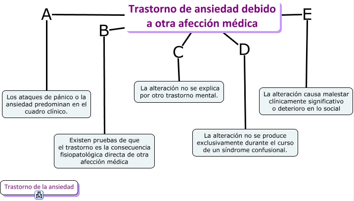 Este Cmap, tiene información relacionada con: Trastorno de ansiedad debido a otra afección médica, Trastorno de ansiedad debido a otra afección médica D La alteración no se produce exclusivamente durante el curso de un síndrome confusional., Trastorno de ansiedad debido a otra afección médica C La alteración no se explica por otro trastorno mental., Trastorno de ansiedad debido a otra afección médica A Los ataques de pánico o la ansiedad predominan en el cuadro clínico., Trastorno de ansiedad debido a otra afección médica E La alteración causa malestar clínicamente significativo o deterioro en lo social, Trastorno de ansiedad debido a otra afección médica B Existen pruebas de que el trastorno es la consecuencia fisiopatológica directa de otra afección médica