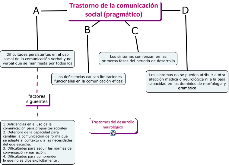 Este Cmap, tiene información relacionada con: Trastorno de la comunicación social (pragmático), Trastorno de la comunicación social (pragmático) D Los síntomas no se pueden atribuir a otra afección médica o neurológica ni a la baja capacidad en los dominios de morfología y gramática, Trastorno de la comunicación social (pragmático) A Dificultades persistentes en el uso social de la comunicación verbal y no verbal que se manifiesta por todos los, Trastorno de la comunicación social (pragmático) B Las deficiencias causan limitaciones funcionales en la comunicación eficaz, Dificultades persistentes en el uso social de la comunicación verbal y no verbal que se manifiesta por todos los factores siguientes 1.Deficiencias en el uso de la comunicación para propósitos sociales 2. Deterioro de la capacidad para cambiar la comunicación de forma que se adapte al contexto o a las necesidades del que escucha. 3. Dificultades para seguir las normas de conversación y narración. 4. Dificultades para comprender lo que no se dice explícitamente ., Trastorno de la comunicación social (pragmático) C Los síntomas comienzan en las primeras fases del período de desarrollo