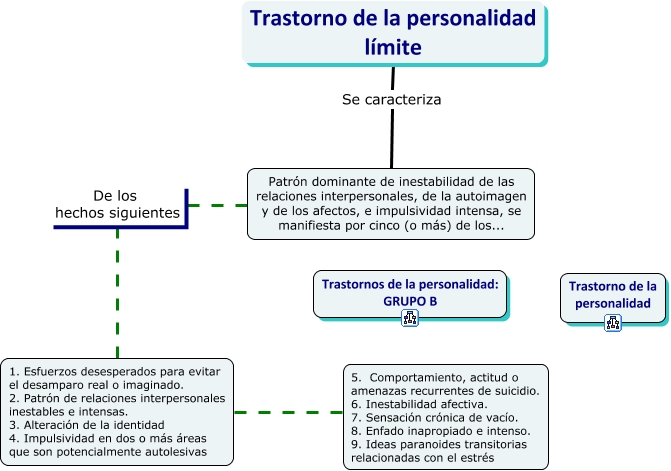Este Cmap, tiene información relacionada con: Trastorno de la personalidad límite, 1. Esfuerzos desesperados para evitar el desamparo real o imaginado. 2. Patrón de relaciones interpersonales inestables e intensas. 3. Alteración de la identidad 4. Impulsividad en dos o más áreas que son potencialmente autolesivas ???? 5. Comportamiento, actitud o amenazas recurrentes de suicidio. 6. Inestabilidad afectiva. 7. Sensación crónica de vacío. 8. Enfado inapropiado e intenso. 9. Ideas paranoides transitorias relacionadas con el estrés, Trastorno de la personalidad límite Se caracteriza Patrón dominante de inestabilidad de las relaciones interpersonales, de la autoimagen y de los afectos, e impulsividad intensa, se manifiesta por cinco (o más) de los..., Patrón dominante de inestabilidad de las relaciones interpersonales, de la autoimagen y de los afectos, e impulsividad intensa, se manifiesta por cinco (o más) de los... De los hechos siguientes 1. Esfuerzos desesperados para evitar el desamparo real o imaginado. 2. Patrón de relaciones interpersonales inestables e intensas. 3. Alteración de la identidad 4. Impulsividad en dos o más áreas que son potencialmente autolesivas