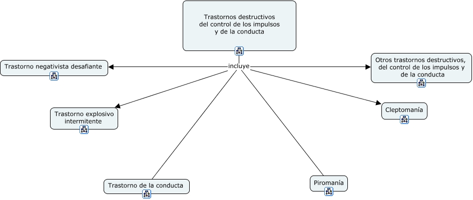Este Cmap, tiene información relacionada con: 15 Trastornos destructivos del control de los impulsos y de la conducta, Trastornos destructivos del control de los impulsos y de la conducta incluye Cleptomanía, Trastornos destructivos del control de los impulsos y de la conducta incluye Piromanía, Trastornos destructivos del control de los impulsos y de la conducta incluye Otros trastornos destructivos, del control de los impulsos y de la conducta, Trastornos destructivos del control de los impulsos y de la conducta incluye Trastorno negativista desafiante, Trastornos destructivos del control de los impulsos y de la conducta incluye Trastorno de la conducta, Trastornos destructivos del control de los impulsos y de la conducta incluye Trastorno explosivo intermitente