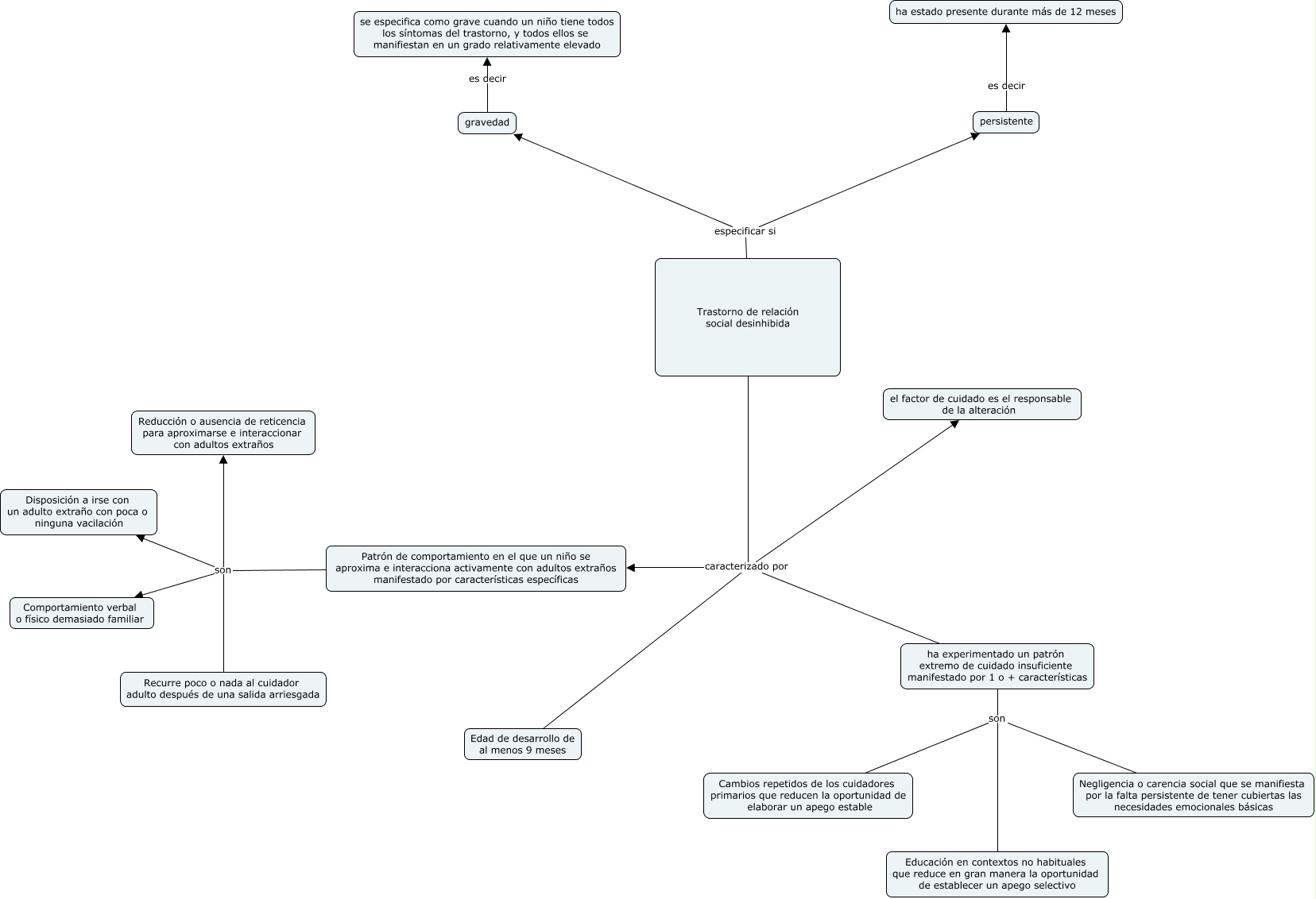 Este Cmap, tiene información relacionada con: 7b Trasrorno de relación social deshinibida, Trastorno de relación social desinhibida caracterizado por Patrón de comportamiento en el que un niño se aproxima e interacciona activamente con adultos extraños manifestado por características específicas, Trastorno de relación social desinhibida especificar si persistente, Patrón de comportamiento en el que un niño se aproxima e interacciona activamente con adultos extraños manifestado por características específicas son Reducción o ausencia de reticencia para aproximarse e interaccionar con adultos extraños, ha experimentado un patrón extremo de cuidado insuficiente manifestado por 1 o + características son Negligencia o carencia social que se manifiesta por la falta persistente de tener cubiertas las necesidades emocionales básicas, Patrón de comportamiento en el que un niño se aproxima e interacciona activamente con adultos extraños manifestado por características específicas son Recurre poco o nada al cuidador adulto después de una salida arriesgada, Trastorno de relación social desinhibida caracterizado por Edad de desarrollo de al menos 9 meses, Patrón de comportamiento en el que un niño se aproxima e interacciona activamente con adultos extraños manifestado por características específicas son Disposición a irse con un adulto extraño con poca o ninguna vacilación, ha experimentado un patrón extremo de cuidado insuficiente manifestado por 1 o + características son Educación en contextos no habituales que reduce en gran manera la oportunidad de establecer un apego selectivo, Trastorno de relación social desinhibida caracterizado por ha experimentado un patrón extremo de cuidado insuficiente manifestado por 1 o + características, ha experimentado un patrón extremo de cuidado insuficiente manifestado por 1 o + características son Cambios repetidos de los cuidadores primarios que reducen la oportunidad de elaborar un apego estable, Patrón de comportamiento en el que un niño se aproxima e interacciona activamente con adultos extraños manifestado por características específicas son Comportamiento verbal o físico demasiado familiar, persistente es decir ha estado presente durante más de 12 meses, Trastorno de relación social desinhibida caracterizado por el factor de cuidado es el responsable de la alteración, Trastorno de relación social desinhibida especificar si gravedad, gravedad es decir se especifica como grave cuando un niño tiene todos los síntomas del trastorno, y todos ellos se manifiestan en un grado relativamente elevado