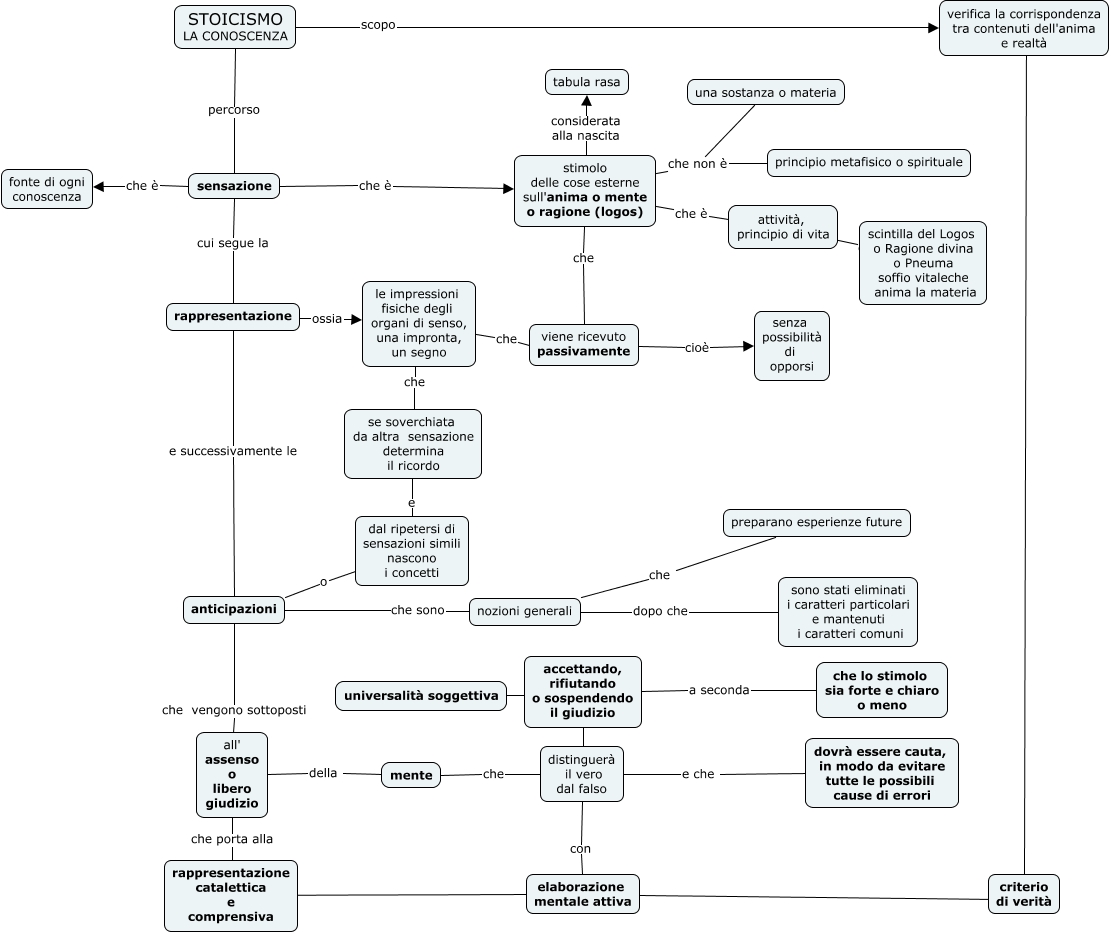 Questa Cmap, creata con IHMC CmapTools, contiene informazioni relative a: Stoicismo-la conoscenza, attività, principio di vita cioè scintilla del Logos o Ragione divina o Pneuma soffio vitaleche anima la materia, dal ripetersi di sensazioni simili nascono i concetti o anticipazioni, stimolo delle cose esterne sull'anima o mente o ragione (logos) considerata alla nascita tabula rasa, nozioni generali dopo che sono stati eliminati i caratteri particolari e mantenuti i caratteri comuni, mente che distinguerà il vero dal falso, stimolo delle cose esterne sull'anima o mente o ragione (logos) che è attività, principio di vita, rappresentazione ossia le impressioni fisiche degli organi di senso, una impronta, un segno, elaborazione mentale attiva ???? rappresentazione catalettica e comprensiva, anticipazioni che vengono sottoposti all' assenso o libero giudizio, stimolo delle cose esterne sull'anima o mente o ragione (logos) che viene ricevuto passivamente, anticipazioni che sono nozioni generali, all' assenso o libero giudizio della mente, le impressioni fisiche degli organi di senso, una impronta, un segno che viene ricevuto passivamente, STOICISMO LA CONOSCENZA percorso sensazione, nozioni generali che preparano esperienze future, viene ricevuto passivamente cioè senza possibilità di opporsi, sensazione cui segue la rappresentazione, distinguerà il vero dal falso e che dovrà essere cauta, in modo da evitare tutte le possibili cause di errori, distinguerà il vero dal falso ???? accettando, rifiutando o sospendendo il giudizio, distinguerà il vero dal falso con elaborazione mentale attiva