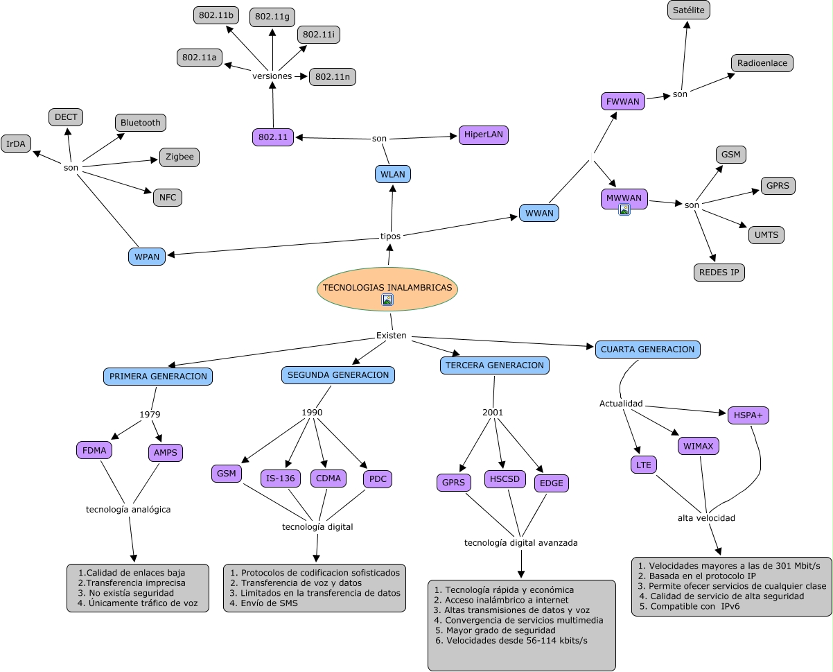 Este Cmap, tiene información relacionada con: TECNOLOGIA INALAMBRICA, CDMA tecnología digital 1. Protocolos de codificacion sofisticados 2. Transferencia de voz y datos 3. Limitados en la transferencia de datos 4. Envío de SMS, WLAN son 802.11, WPAN son NFC, FDMA tecnología analógica 1.Calidad de enlaces baja 2.Transferencia imprecisa 3. No existía seguridad 4. Únicamente tráfico de voz, MWWAN son REDES IP, FWWAN son Satélite, 802.11 versiones 802.11b, TERCERA GENERACION 2001 GPRS, TERCERA GENERACION 2001 HSCSD, SEGUNDA GENERACION 1990 GSM, TECNOLOGIAS INALAMBRICAS Existen SEGUNDA GENERACION, CUARTA GENERACION Actualidad WIMAX, TECNOLOGIAS INALAMBRICAS Existen CUARTA GENERACION, MWWAN son UMTS, PRIMERA GENERACION 1979 AMPS, WPAN son DECT, SEGUNDA GENERACION 1990 IS-136, TECNOLOGIAS INALAMBRICAS Existen PRIMERA GENERACION, TECNOLOGIAS INALAMBRICAS tipos WLAN, FWWAN son Radioenlace