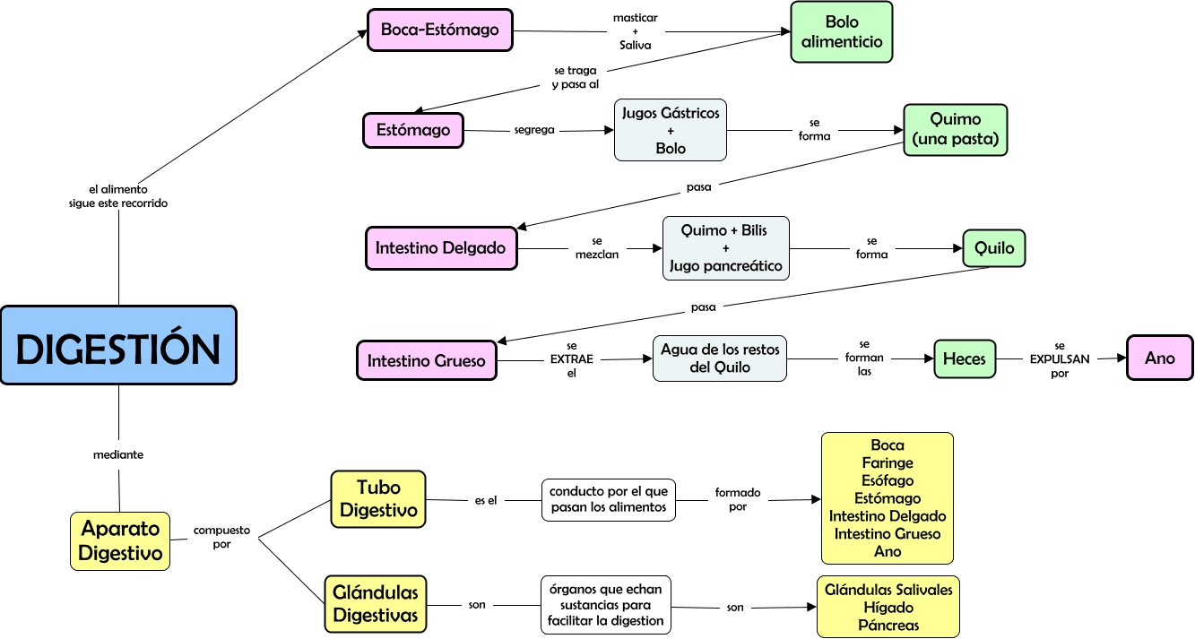 Este Cmap, tiene información relacionada con: 3 - DIGESTIÓN, Quilo pasa Intestino Grueso, Heces se EXPULSAN por Ano, DIGESTIÓN mediante Aparato Digestivo, Estómago segrega Jugos Gástricos + Bolo, órganos que echan sustancias para facilitar la digestion son Glándulas Salivales Hígado Páncreas, Quimo + Bilis + Jugo pancreático se forma Quilo, DIGESTIÓN el alimento sigue este recorrido Boca-Estómago, Agua de los restos del Quilo se forman las Heces, Bolo alimenticio se traga y pasa al Estómago, Tubo Digestivo es el conducto por el que pasan los alimentos, Intestino Grueso se EXTRAE el Agua de los restos del Quilo, Boca-Estómago masticar + Saliva Bolo alimenticio, Quimo (una pasta) pasa Intestino Delgado, Glándulas Digestivas son órganos que echan sustancias para facilitar la digestion, Intestino Delgado se mezclan Quimo + Bilis + Jugo pancreático, Jugos Gástricos + Bolo se forma Quimo (una pasta), Aparato Digestivo compuesto por Tubo Digestivo, conducto por el que pasan los alimentos formado por Boca Faringe Esófago Estómago Intestino Delgado Intestino Grueso Ano, Aparato Digestivo compuesto por Glándulas Digestivas