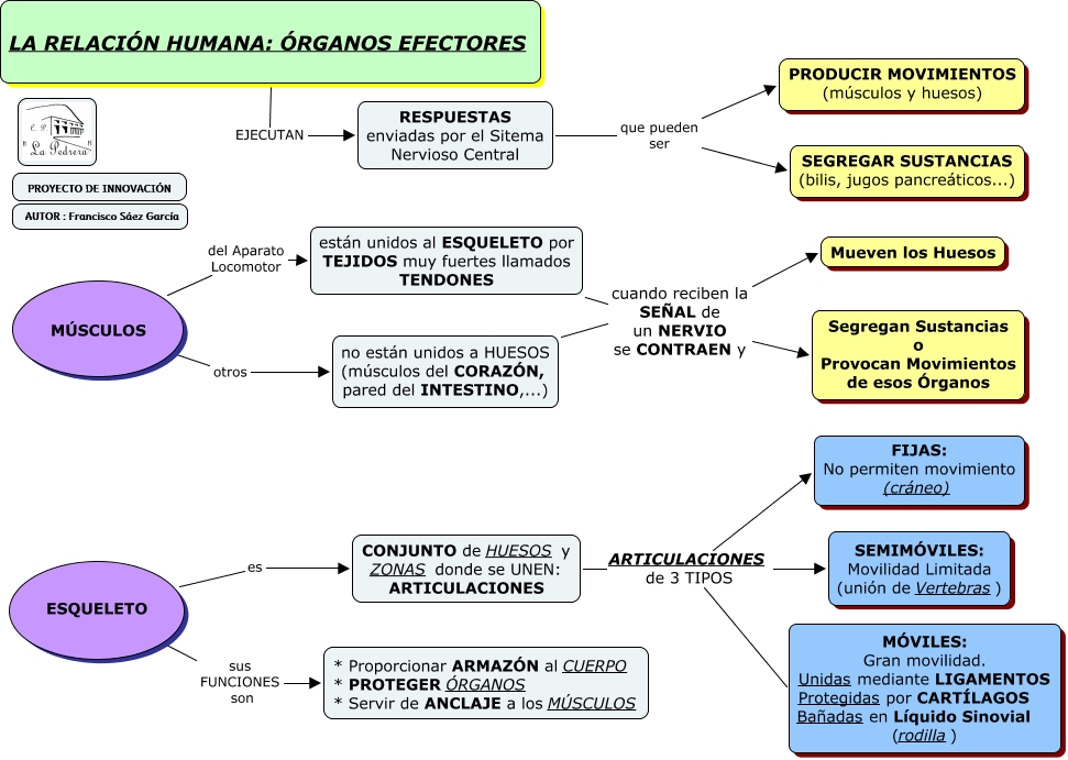 Este Cmap, tiene información relacionada con: 3 - LA RELACIÓN HUMANA - ÓRGANOS EFECTORES, no están unidos a HUESOS (músculos del CORAZÓN, pared del INTESTINO,...) cuando reciben la SEÑAL de un NERVIO se CONTRAEN y Mueven los Huesos, CONJUNTO de HUESOS y ZONAS donde se UNEN: ARTICULACIONES ARTICULACIONES de 3 TIPOS MÓVILES: Gran movilidad. Unidas mediante LIGAMENTOS Protegidas por CART�?LAGOS Bañadas en Líquido Sinovial (rodilla), están unidos al ESQUELETO por TEJIDOS muy fuertes llamados TENDONES cuando reciben la SEÑAL de un NERVIO se CONTRAEN y Mueven los Huesos, RESPUESTAS enviadas por el Sitema Nervioso Central que pueden ser PRODUCIR MOVIMIENTOS (músculos y huesos), CONJUNTO de HUESOS y ZONAS donde se UNEN: ARTICULACIONES ARTICULACIONES de 3 TIPOS FIJAS: No permiten movimiento (cráneo), MÚSCULOS otros no están unidos a HUESOS (músculos del CORAZÓN, pared del INTESTINO,...), ESQUELETO es CONJUNTO de HUESOS y ZONAS donde se UNEN: ARTICULACIONES, MÚSCULOS del Aparato Locomotor están unidos al ESQUELETO por TEJIDOS muy fuertes llamados TENDONES, LA RELACIÓN HUMANA: ÓRGANOS EFECTORES EJECUTAN RESPUESTAS enviadas por el Sitema Nervioso Central, están unidos al ESQUELETO por TEJIDOS muy fuertes llamados TENDONES cuando reciben la SEÑAL de un NERVIO se CONTRAEN y Segregan Sustancias o Provocan Movimientos de esos Órganos, RESPUESTAS enviadas por el Sitema Nervioso Central que pueden ser SEGREGAR SUSTANCIAS (bilis, jugos pancreáticos...), ESQUELETO sus FUNCIONES son * Proporcionar ARMAZÓN al CUERPO * PROTEGER ÓRGANOS * Servir de ANCLAJE a los MÚSCULOS, CONJUNTO de HUESOS y ZONAS donde se UNEN: ARTICULACIONES ARTICULACIONES de 3 TIPOS SEMIMÓVILES: Movilidad Limitada (unión de Vertebras), no están unidos a HUESOS (músculos del CORAZÓN, pared del INTESTINO,...) cuando reciben la SEÑAL de un NERVIO se CONTRAEN y Segregan Sustancias o Provocan Movimientos de esos Órganos