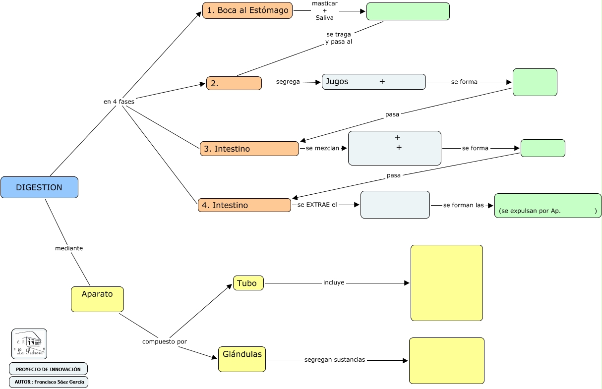 Este Cmap, tiene información relacionada con: DIGESTIÓN MUDO, pasa 3. Intestino, 2. segrega Jugos +, + + se forma, se traga y pasa al 2., Aparato compuesto por Tubo, DIGESTION en 4 fases 3. Intestino, DIGESTION en 4 fases 4. Intestino, DIGESTION en 4 fases 1. Boca al Estómago, 3. Intestino se mezclan + +, se forman las (se expulsan por Ap. ), pasa 4. Intestino, 1. Boca al Estómago masticar + Saliva, Jugos + se forma, DIGESTION en 4 fases 2., DIGESTION mediante Aparato, Aparato compuesto por Glándulas, 4. Intestino se EXTRAE el, Glándulas segregan sustancias, Tubo incluye