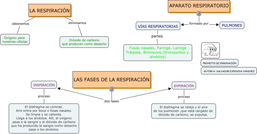 Este Cmap, tiene información relacionada con: LA RESPIRACIÓN, EXPIRACIÓN proceso El diafragma se relaja y el aire de los pulmones ,que está cargado de dióxido de carbono, se expulsa., APARATO RESPIRATORIO formado por PULMONES, APARATO RESPIRATORIO formado por V�?AS RESPIRATORIAS, LA RESPIRACIÓN eliminamos Dióxido de carbono que producen como desecho, LAS FASES DE LA RESPIRACIÓN dos fases INSPIRACIÓN, V�?AS RESPIRATORIAS partes Fosas nasales, Faringe, Laringe Tráquea, Bronquios,(bronquiolos y alvéolos), LA RESPIRACIÓN obtenemos Oxígeno para nuestras células, LAS FASES DE LA RESPIRACIÓN dos fases EXPIRACIÓN, INSPIRACIÓN proceso El diafragma se contrae. Aire entra por boca o fosas nasales. Se limpia y se calienta. Llega a los alvéolos. Allí, el oxígeno pasa a la sangre y el dióxido de carbono que ha producido la sangre como desecho pasa a los alvéolos.