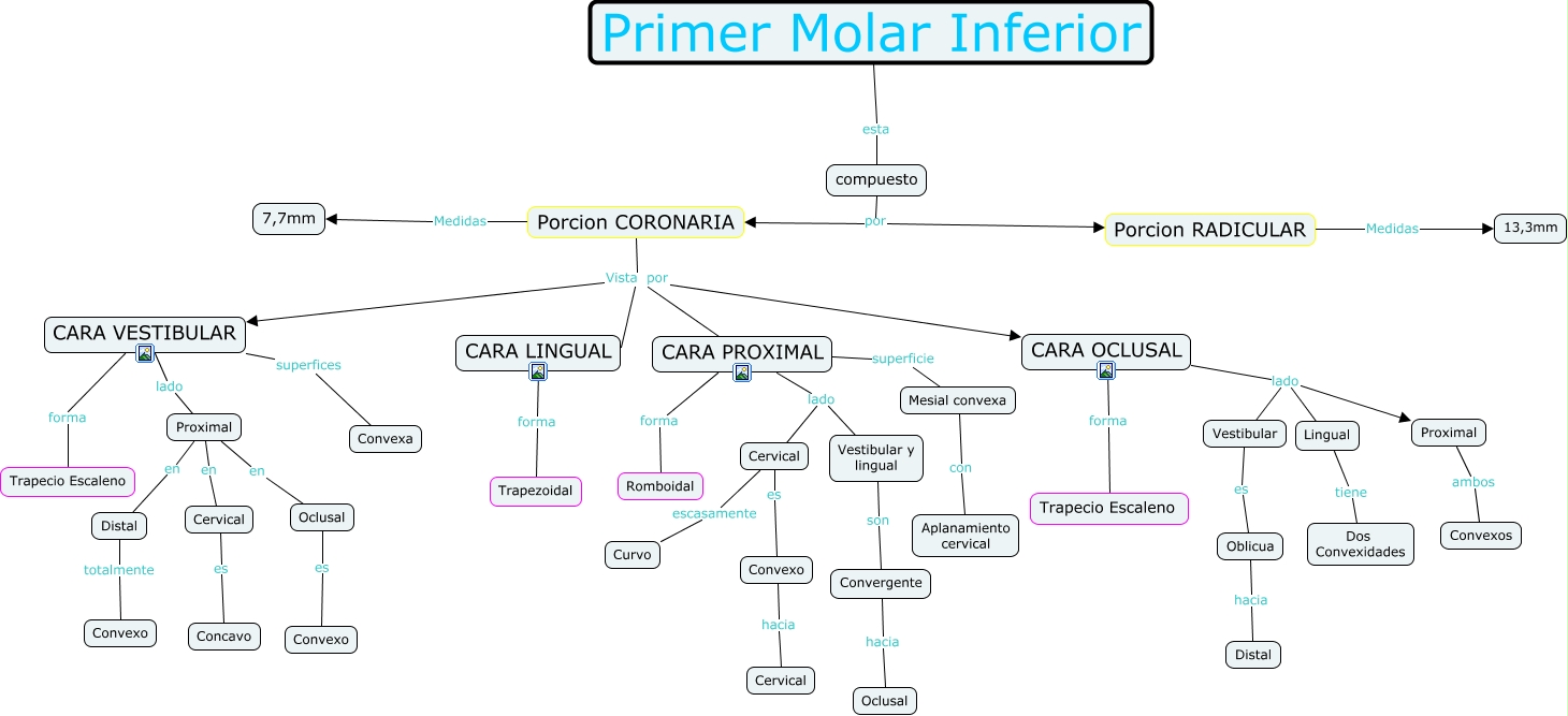 Este Cmap, tiene información relacionada con: PRIMER MOLAR INFERIOR, Porcion CORONARIA Vista por CARA VESTIBULAR, Convergente hacia Oclusal, CARA OCLUSAL forma Trapecio Escaleno, compuesto por Porcion CORONARIA, Distal totalmente Convexo, Cervical es Convexo, Porcion CORONARIA Vista por CARA OCLUSAL, Proximal en Oclusal, CARA OCLUSAL lado Proximal, Porcion RADICULAR Medidas 13,3mm, CARA VESTIBULAR superfices Convexa, Proximal en Distal, CARA PROXIMAL forma Romboidal, compuesto por Porcion RADICULAR, CARA VESTIBULAR lado Proximal, Primer Molar Inferior esta compuesto, CARA OCLUSAL lado Lingual, CARA PROXIMAL lado Vestibular y lingual, Proximal ambos Convexos, Porcion CORONARIA Vista por CARA PROXIMAL