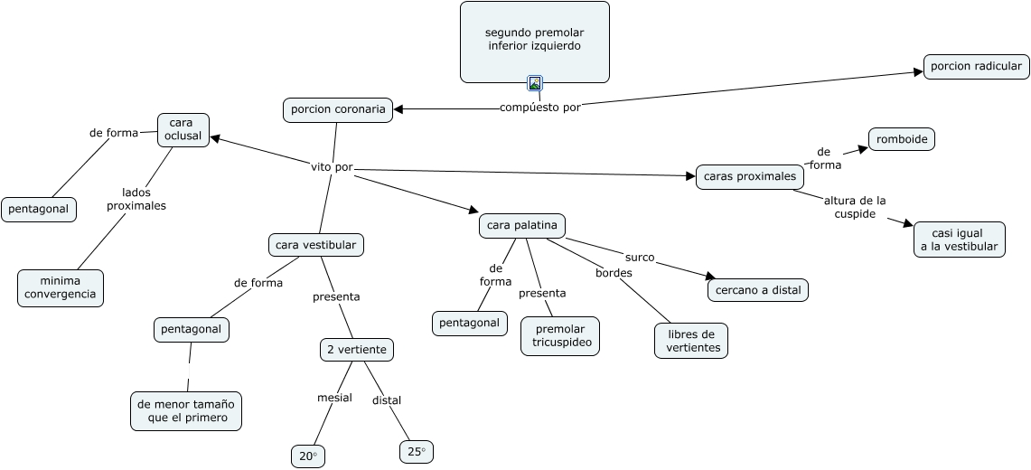 Este Cmap, tiene información relacionada con: segundo premolar inferior izq, cara palatina bordes libres de vertientes, cara palatina surco cercano a distal, 2 vertiente distal 25°, porcion coronaria vito por caras proximales, porcion coronaria vito por cara palatina, segundo premolar inferior izquierdo compúesto por porcion radicular, cara palatina presenta premolar tricuspideo, cara palatina de forma pentagonal, cara vestibular presenta 2 vertiente, cara oclusal de forma pentagonal, pentagonal de menor tamaño que el primero, segundo premolar inferior izquierdo compúesto por porcion coronaria, caras proximales altura de la cuspide casi igual a la vestibular, caras proximales de forma romboide, cara oclusal lados proximales minima convergencia, porcion coronaria vito por cara vestibular, 2 vertiente mesial 20°, cara vestibular de forma pentagonal, porcion coronaria vito por cara oclusal