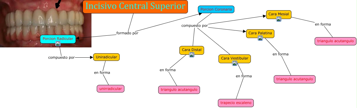 Este Cmap, tiene información relacionada con: incisivo central superior, Cara Mesial en forma triangulo acutangulo, Uniradicular en forma unirradicular, Porcion Coronaria compuesto por Cara Vestibular, Cara Distal en forma triangulo acutangulo, Porcion Coronaria compuesto por Cara Palatina, Porcion Coronaria compuesto por Cara Distal, Porcion Radicular compuesto por Uniradicular, Incisivo Central Superior formado por Porcion Radicular, Cara Vestibular en forma trapecio escaleno, Porcion Coronaria compuesto por Cara Mesial, Incisivo Central Superior formado por Porcion Coronaria, Cara Palatina en forma triangulo acutangulo
