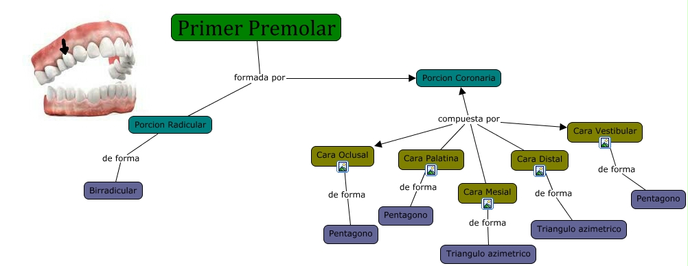 Este Cmap, tiene información relacionada con: primer premolar superior, Primer Premolar formada por Porcion Radicular, Cara Oclusal de forma Pentagono, Cara Vestibular de forma Pentagono, Cara Distal de forma Triangulo azimetrico, Primer Premolar formada por Porcion Coronaria, Cara Palatina compuesta por Porcion Coronaria, Cara Palatina compuesta por Cara Mesial, Cara Mesial de forma Triangulo azimetrico, Porcion Radicular de forma Birradicular, Cara Palatina compuesta por Cara Distal, Cara Palatina compuesta por Cara Vestibular, Cara Palatina compuesta por Cara Oclusal, Cara Palatina de forma Pentagono