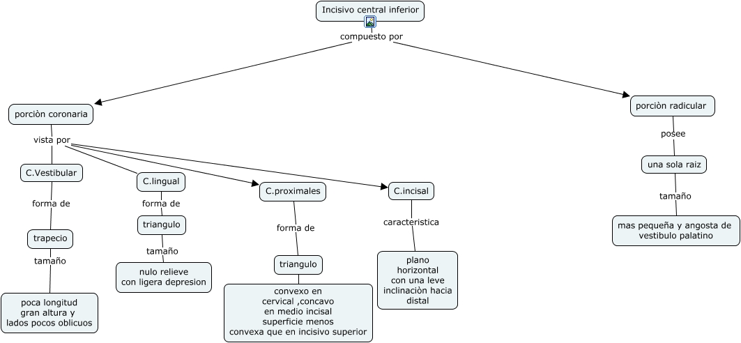 Este Cmap, tiene información relacionada con: incisivo central inferior, C.proximales forma de triangulo, porciòn coronaria vista por C.incisal, triangulo tamaño nulo relieve con ligera depresion, porciòn coronaria vista por C.lingual, C.incisal caracteristica plano horizontal con una leve inclinaciòn hacia distal, Incisivo central inferior compuesto por porciòn coronaria, porciòn coronaria vista por C.proximales, trapecio tamaño poca longitud gran altura y lados pocos oblicuos, triangulo tamaño convexo en cervical ,concavo en medio incisal superficie menos convexa que en incisivo superior, C.Vestibular forma de trapecio, una sola raiz tamaño mas pequeña y angosta de vestibulo palatino, porciòn coronaria vista por C.Vestibular, C.lingual forma de triangulo, Incisivo central inferior compuesto por porciòn radicular, porciòn radicular posee una sola raiz