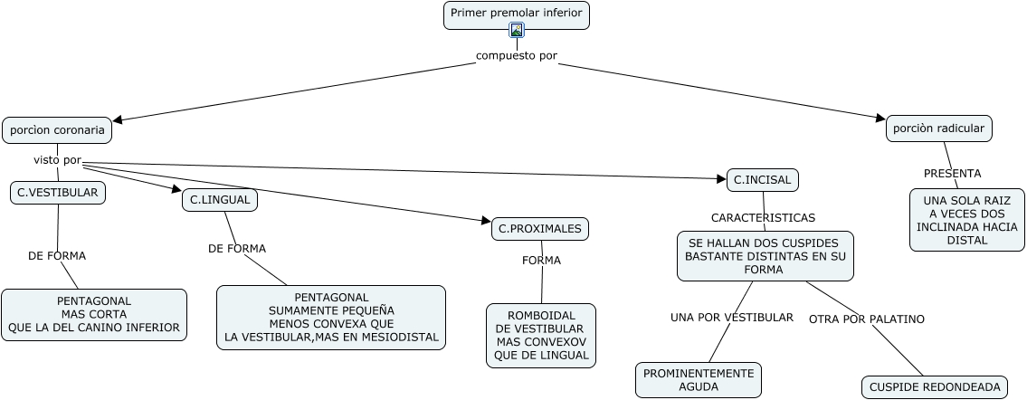 Este Cmap, tiene información relacionada con: PRIMER PREMOLAR INFERIOR, Primer premolar inferior compuesto por porcìon coronaria, porciòn radicular PRESENTA UNA SOLA RAIZ A VECES DOS INCLINADA HACIA DISTAL, C.VESTIBULAR DE FORMA PENTAGONAL MAS CORTA QUE LA DEL CANINO INFERIOR, porcìon coronaria visto por C.PROXIMALES, C.LINGUAL DE FORMA PENTAGONAL SUMAMENTE PEQUEÑA MENOS CONVEXA QUE LA VESTIBULAR,MAS EN MESIODISTAL, C.PROXIMALES FORMA ROMBOIDAL DE VESTIBULAR MAS CONVEXOV QUE DE LINGUAL, porcìon coronaria visto por C.INCISAL, porcìon coronaria visto por C.LINGUAL, SE HALLAN DOS CUSPIDES BASTANTE DISTINTAS EN SU FORMA OTRA POR PALATINO CUSPIDE REDONDEADA, SE HALLAN DOS CUSPIDES BASTANTE DISTINTAS EN SU FORMA UNA POR VESTIBULAR PROMINENTEMENTE AGUDA, C.INCISAL CARACTERISTICAS SE HALLAN DOS CUSPIDES BASTANTE DISTINTAS EN SU FORMA, Primer premolar inferior compuesto por porciòn radicular, porcìon coronaria visto por C.VESTIBULAR