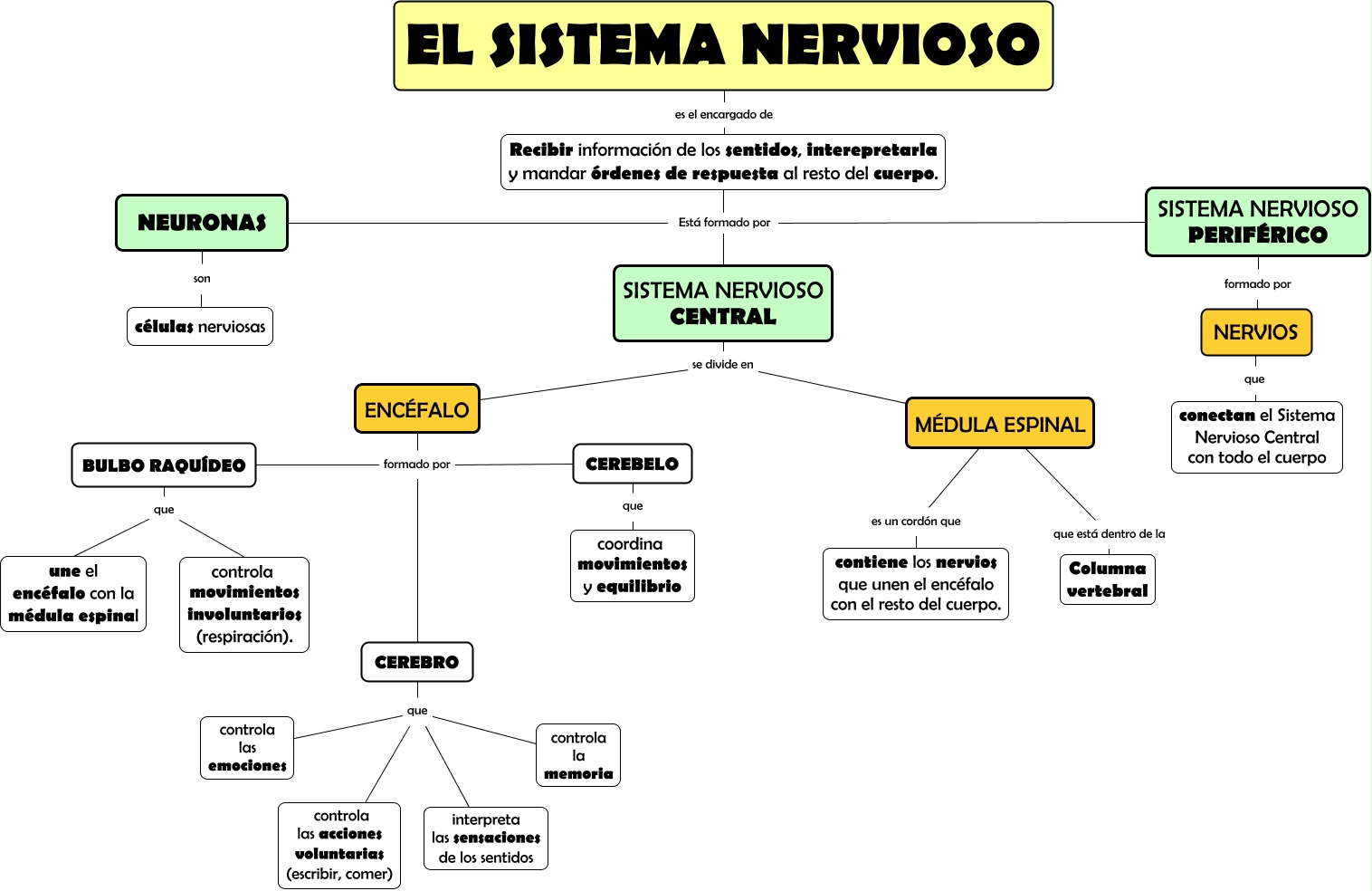 Este Cmap, tiene información relacionada con: SISTEMA NERVIOSO, SISTEMA NERVIOSO PERIFÉRICO formado por NERVIOS, CEREBELO que coordina movimientos y equilibrio, Recibir información de los sentidos, interepretarla y mandar órdenes de respuesta al resto del cuerpo. Está formado por NEURONAS, CEREBRO que controla las acciones voluntarias (escribir, comer), CEREBRO que controla las emociones, Recibir información de los sentidos, interepretarla y mandar órdenes de respuesta al resto del cuerpo. Está formado por SISTEMA NERVIOSO PERIFÉRICO, ENCÉFALO formado por CEREBRO, NERVIOS que conectan el Sistema Nervioso Central con todo el cuerpo, ENCÉFALO formado por CEREBELO, BULBO RAQUÍDEO que controla movimientos involuntarios (respiración)., CEREBRO que interpreta las sensaciones de los sentidos, SISTEMA NERVIOSO CENTRAL se divide en MÉDULA ESPINAL, CEREBRO que controla la memoria, Recibir información de los sentidos, interepretarla y mandar órdenes de respuesta al resto del cuerpo. Está formado por SISTEMA NERVIOSO CENTRAL, BULBO RAQUÍDEO que une el encéfalo con la médula espinal, NEURONAS son células nerviosas, MÉDULA ESPINAL que está dentro de la Columna vertebral, EL SISTEMA NERVIOSO es el encargado de Recibir información de los sentidos, interepretarla y mandar órdenes de respuesta al resto del cuerpo., ENCÉFALO formado por BULBO RAQUÍDEO, SISTEMA NERVIOSO CENTRAL se divide en ENCÉFALO