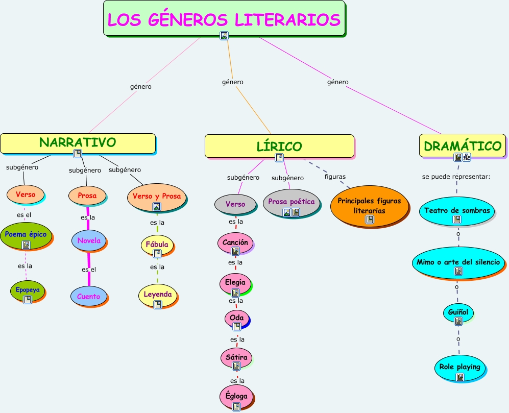 Este Cmap, tiene información relacionada con: LOS GÉNEROS LITERARIOS, LÍRICO subgénero Verso, NARRATIVO subgénero Prosa, NARRATIVO subgénero Verso, LÍRICO figuras Principales figuras literarias, LOS GÉNEROS LITERARIOS género NARRATIVO, Fábula es la Leyenda, Guiñol o Role playing, Verso y Prosa es la Fábula, NARRATIVO subgénero Verso y Prosa, Sátira es la Égloga, Elegía es la Oda, LOS GÉNEROS LITERARIOS género DRAMÁTICO, Poema épico es la Epopeya, LÍRICO subgénero Prosa poética, Mimo o arte del silencio o Guiñol, Verso es el Poema épico, Prosa es la Novela, Verso es la Canción, Novela es el Cuento, LOS GÉNEROS LITERARIOS género LÍRICO