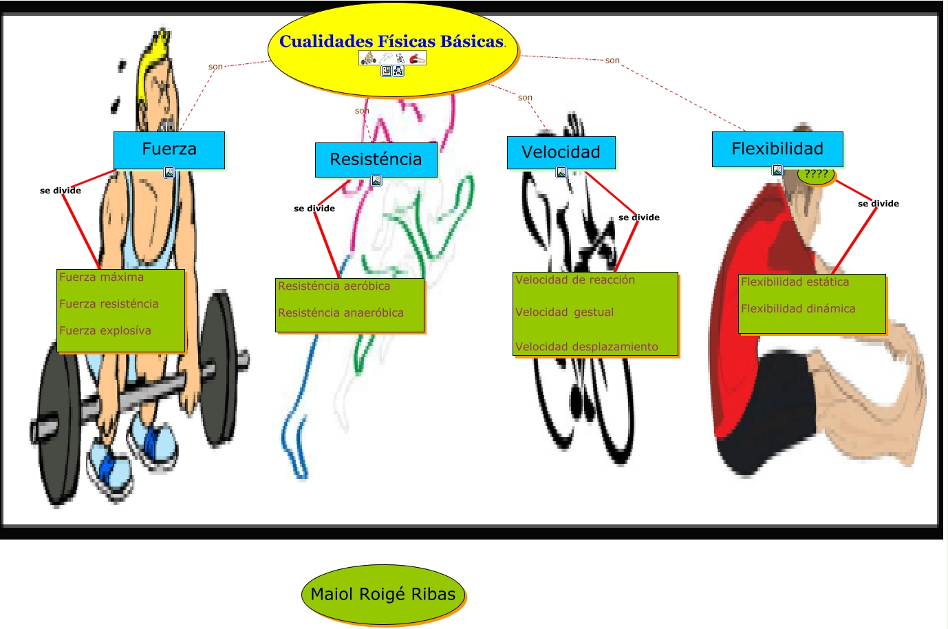 Este Cmap, tiene información relacionada con: cualidades físicas basicas eduación física, Cualidades Físicas Básicas. son Fuerza, Flexibilidad se divide Flexibilidad estática Flexibilidad dinámica, Velocidad se divide Velocidad de reacción Velocidad gestual Velocidad desplazamiento, Cualidades Físicas Básicas. son Velocidad, Fuerza se divide Fuerza máxima Fuerza resisténcia Fuerza explosíva, Cualidades Físicas Básicas. son Resisténcia, Resisténcia se divide Resisténcia aeróbica Resisténcia anaeróbica, Cualidades Físicas Básicas. son Flexibilidad
