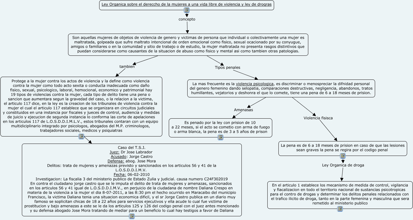 Este Cmap, tiene información relacionada con: mujer libre de violencia, Son aquellas mujeres de objetos de violencia de genero y victimas de persona que individual o colectivamente una mujer es maltratada, golpeada que sufre maltrato intencional de orden emocional como fisico, sexual ocacionado por su conyugue, amigos o familiares o en la comunidad y sitio de trabajo o de estudio, la mujer maltratada no presenta rasgos distintivos que puedan considerarse como causantes de la situacion de abuso como fisico y mental asi como tambien otras patologias. Tipos penales La mas frecuente es la violencia psicologica, es discriminar o menospreciar la difnidad personal del genero femenino dando selopatia, comparaciones destructivas, negligencia, abandonos, tratos humillantes, vejatorios y deshonra el que lo comete, tiene una pena de 6 a 18 meses de prision., La mas frecuente es la violencia psicologica, es discriminar o menospreciar la difnidad personal del genero femenino dando selopatia, comparaciones destructivas, negligencia, abandonos, tratos humillantes, vejatorios y deshonra el que lo comete, tiene una pena de 6 a 18 meses de prision. Violencia fisisca La pena es de 6 a 18 meses de prision en caso de que las lesiones sean graves la pena se regira por el codigo penal, La pena es de 6 a 18 meses de prision en caso de que las lesiones sean graves la pena se regira por el codigo penal Ley Organica de droga En el articulo 1 establece los mecanismo de medida de control, vigilancia y fiacalizacion en todo el territorio nacional de sustancias psicotropicas para el contro de drogas y determinar los delitos penales relacionados con el trafico ilicito de droga, tanto en la parte femenina y masculina que sera remetido al ministerio publico, Protege a la mujer contra los actos de violencia y la define como violencia contra la mujer como todo acto sexita o conducta inadecuada como daño fisico, sexual, psicologico, laboral, hemocional, economico y patrimonial hay 19 tipos de violencias contra la mujer, cada tipo de delito tiene una pena o sancion que aumentara segun la gravedad del caso, o la relacion a la victima, el articulo 117 dice, en la ley es la creacion de los tribunales de violencia contra la mujer el cual el articulo 117 establece que se organizara en circuitos judiciales y constituidos en una instancia por fiscales y jueces de control, audiencia y medidas de juicio y ejecucion de segunda instancia lo conforma las corte de apelaciones en los articulos 117 de L.O.S.D.D.I.M.L.V., estos tribunales contaran con un equipo multidiciplinario integrado por psicologos, abogados del M.P. criminologos, trabajadores sociales, medicos y psiquiatras ???? Caso del T.S.J. Juez: Dr Jose Labrador Acusado: Jorge Castro Defensa: abog. Jose Mora Delitos: trata de mujeres y amenazas previsto y sancionados en los articulos 56 y 41 de la L.O.S.D.D.I.M.V. Fecha: 06-02-2010 Investigacion: La fiscalia 3 del ministerio publico de Estado Zulia y judicial. causa numero C24F302019 En contra el ciudadano jorge castro que se le imputa el delito de trata de mujeres y amenazas, sancionados en los articulos 56 y 41 igual de L.O.S.D.D.I.M.V., en perjuicio de la ciudadana de nombre Daliana Crespo en materia de la violencia a la mujer el dia 8-07-2011, a las 8:30 pm el hecho ocurrido en Maracaibo del municipio Francisco, la victima Daliana tenia una situacion economica dificil, y el sr Jorge Castro publica en un diario muy famoso se soplicitan chicas de 18 a 22 años para servicios ejecutivos y ella acude lo cual fue victima de prostitucion y bajo amenazas a este se le da los articulos 125 y 126 del codigo penal con el juez antes mencionado y su defensa abogado Jose Mora tratando de mediar para un beneficio lo cual hay testigos a favor de Daliana, Son aquellas mujeres de objetos de violencia de genero y victimas de persona que individual o colectivamente una mujer es maltratada, golpeada que sufre maltrato intencional de orden emocional como fisico, sexual ocacionado por su conyugue, amigos o familiares o en la comunidad y sitio de trabajo o de estudio, la mujer maltratada no presenta rasgos distintivos que puedan considerarse como causantes de la situacion de abuso como fisico y mental asi como tambien otras patologias. tambien Protege a la mujer contra los actos de violencia y la define como violencia contra la mujer como todo acto sexita o conducta inadecuada como daño fisico, sexual, psicologico, laboral, hemocional, economico y patrimonial hay 19 tipos de violencias contra la mujer, cada tipo de delito tiene una pena o sancion que aumentara segun la gravedad del caso, o la relacion a la victima, el articulo 117 dice, en la ley es la creacion de los tribunales de violencia contra la mujer el cual el articulo 117 establece que se organizara en circuitos judiciales y constituidos en una instancia por fiscales y jueces de control, audiencia y medidas de juicio y ejecucion de segunda instancia lo conforma las corte de apelaciones en los articulos 117 de L.O.S.D.D.I.M.L.V., estos tribunales contaran con un equipo multidiciplinario integrado por psicologos, abogados del M.P. criminologos, trabajadores sociales, medicos y psiquiatras, Ley Organica sobre el dereccho de la mujeres a una vida libre de violencia y ley de drogras concepto Son aquellas mujeres de objetos de violencia de genero y victimas de persona que individual o colectivamente una mujer es maltratada, golpeada que sufre maltrato intencional de orden emocional como fisico, sexual ocacionado por su conyugue, amigos o familiares o en la comunidad y sitio de trabajo o de estudio, la mujer maltratada no presenta rasgos distintivos que puedan considerarse como causantes de la situacion de abuso como fisico y mental asi como tambien otras patologias., La mas frecuente es la violencia psicologica, es discriminar o menospreciar la difnidad personal del genero femenino dando selopatia, comparaciones destructivas, negligencia, abandonos, tratos humillantes, vejatorios y deshonra el 
