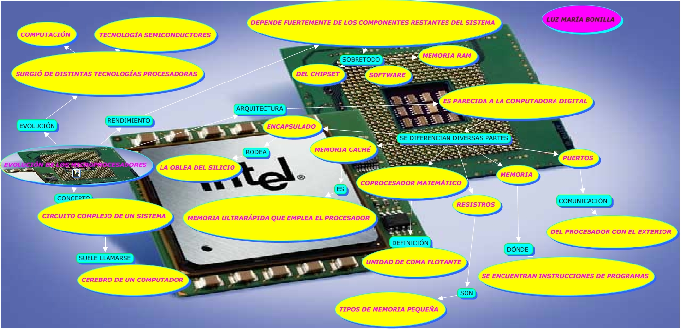 Este Cmap, tiene información relacionada con: LUZ MARÍA BONILLA, PUERTOS COMUNICACIÓN DEL PROCESADOR CON EL EXTERIOR, EVOLUCIÓN DE LOS MICROPROCESADORES ARQUITECTURA ES PARECIDA A LA COMPUTADORA DIGITAL, ES PARECIDA A LA COMPUTADORA DIGITAL SE DIFERENCIAN DIVERSAS PARTES COPROCESADOR MATEMÁTICO, SURGIÓ DE DISTINTAS TECNOLOGÍAS PROCESADORAS COMO COMPUTACIÓN, SURGIÓ DE DISTINTAS TECNOLOGÍAS PROCESADORAS COMO TECNOLOGÍA SEMICONDUCTORES, ES PARECIDA A LA COMPUTADORA DIGITAL SE DIFERENCIAN DIVERSAS PARTES MEMORIA CACHÉ, DEPENDE FUERTEMENTE DE LOS COMPONENTES RESTANTES DEL SISTEMA SOBRETODO SOFTWARE, ENCAPSULADO RODEA LA OBLEA DEL SILICIO, DEPENDE FUERTEMENTE DE LOS COMPONENTES RESTANTES DEL SISTEMA SOBRETODO DEL CHIPSET, DEPENDE FUERTEMENTE DE LOS COMPONENTES RESTANTES DEL SISTEMA SOBRETODO MEMORIA RAM, CIRCUITO COMPLEJO DE UN SISTEMA SUELE LLAMARSE CEREBRO DE UN COMPUTADOR, EVOLUCIÓN DE LOS MICROPROCESADORES CONCEPTO CIRCUITO COMPLEJO DE UN SISTEMA, EVOLUCIÓN DE LOS MICROPROCESADORES RENDIMIENTO DEPENDE FUERTEMENTE DE LOS COMPONENTES RESTANTES DEL SISTEMA, MEMORIA DÓNDE SE ENCUENTRAN INSTRUCCIONES DE PROGRAMAS, REGISTROS SON TIPOS DE MEMORIA PEQUEÑA, MEMORIA CACHÉ ES MEMORIA ULTRARÁPIDA QUE EMPLEA EL PROCESADOR, ES PARECIDA A LA COMPUTADORA DIGITAL SE DIFERENCIAN DIVERSAS PARTES MEMORIA, COPROCESADOR MATEMÁTICO DEFINICIÓN UNIDAD DE COMA FLOTANTE, EVOLUCIÓN DE LOS MICROPROCESADORES EVOLUCIÓN SURGIÓ DE DISTINTAS TECNOLOGÍAS PROCESADORAS, ES PARECIDA A LA COMPUTADORA DIGITAL SE DIFERENCIAN DIVERSAS PARTES REGISTROS