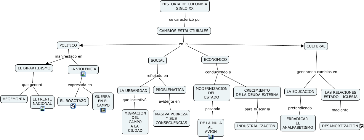 Este Cmap, tiene información relacionada con: HISTORIA DE COLOMBIA SIGLO XX, CAMBIOS ESTRUCTURALES en lo ECONOMICO, POLITICO manifestado en EL BIPARTIDISMO, LA URBANIDAD que incentivó MIGRACION DEL CAMPO A LA CIUDAD, LA EDUCACION pretendiendo ERRADICAR EL ANALFABETISMO, ECONOMICO conduciendo a MODERNIZACION DEL ESTADO, EL BIPARTIDISMO que generó EL FRENTE NACIONAL, SOCIAL reflejado en PROBLEMATICA, DESAMORTIZACION consistió LA SEPARACION DEL PODER DE LA IGLESIA EN ASUNTOS DEL ESTADO, CRECIMIENTO DE LA DEUDA EXTERNA para buscar la INDUSTRIALIZACION, CAMBIOS ESTRUCTURALES en lo SOCIAL, CULTURAL generando cambios en LA EDUCACION, DESAMORTIZACION consistió AMPLIAR LA BASE TRIBITARIA CON LOS BIENES PERTENECIENTES A LA IGLESIA CATOLICA, LAS RELACIONES ESTADO - IGLESIA madiante DESAMORTIZACION, MODERNIZACION DEL ESTADO pasando DE LA MULA AL AVION, CAMBIOS ESTRUCTURALES en lo POLITICO, ECONOMICO conduciendo a CRECIMIENTO DE LA DEUDA EXTERNA, SOCIAL reflejado en LA URBANIDAD, CAMBIOS ESTRUCTURALES en lo CULTURAL, EL BIPARTIDISMO que generó HEGEMONIA, LA VIOLENCIA expresada en EL BOGOTAZO