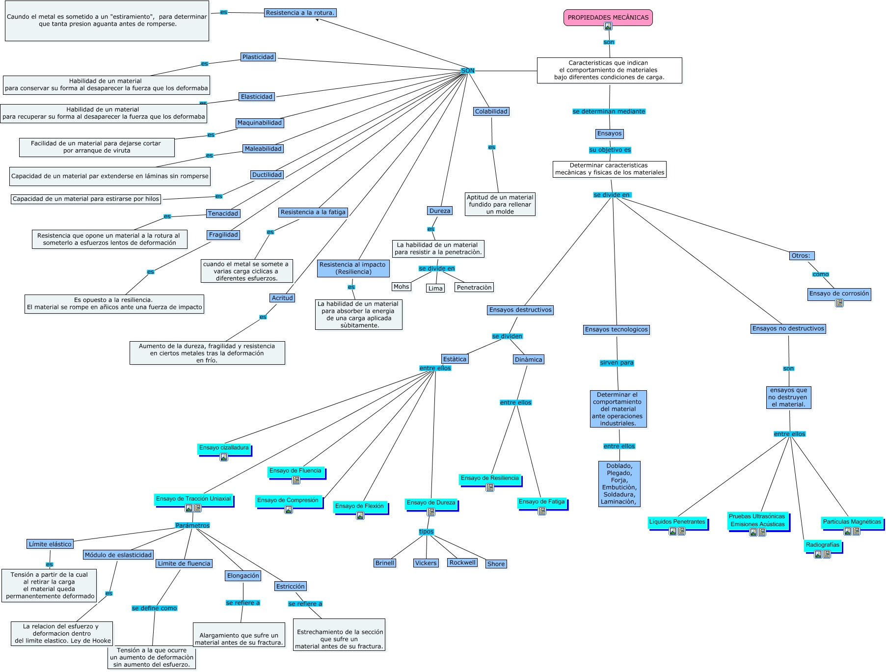 Este Cmap, tiene información relacionada con: PROPIEDADES MECANICAS, Caracteristicas que indican el comportamiento de materiales bajo diferentes condiciones de carga. SON Acritud, La habilidad de un material para resistir a la penetraciòn. se divide en Lima, Elongación se refiere a Alargamiento que sufre un material antes de su fractura., Ensayos su objetivo es Determinar caracteristicas mecànicas y fisicas de los materiales, Elasticidad es Habilidad de un material para recuperar su forma al desaparecer la fuerza que los deformaba, Módulo de eslasticidad es La relacion del esfuerzo y deformacion dentro del limite elastico. Ley de Hooke, ensayos que no destruyen el material. entre ellos Radiografías, Límite elástico es Tensión a partir de la cual al retirar la carga el material queda permanentemente deformado, ensayos que no destruyen el material. entre ellos Partículas Magnéticas, PROPIEDADES MECÀNICAS son Caracteristicas que indican el comportamiento de materiales bajo diferentes condiciones de carga., La habilidad de un material para resistir a la penetraciòn. se divide en Mohs, Ensayos no destructivos son ensayos que no destruyen el material., Ensayo de Dureza tipos Rockwell, Resistencia al impacto (Resiliencia) es La habilidad de un material para absorber la energia de una carga aplicada sùbitamente., Ensayo de Dureza tipos Vickers, Ensayos destructivos se dividen Dinàmica, Plasticidad es Habilidad de un material para conservar su forma al desaparecer la fuerza que los deformaba, Determinar caracteristicas mecànicas y fisicas de los materiales se divide en Ensayos no destructivos, Caracteristicas que indican el comportamiento de materiales bajo diferentes condiciones de carga. SON Maleabilidad, Caracteristicas que indican el comportamiento de materiales bajo diferentes condiciones de carga. SON Maquinabilidad